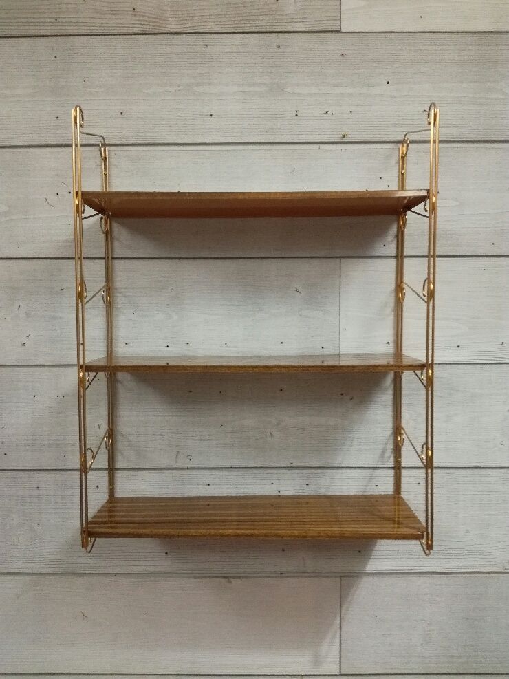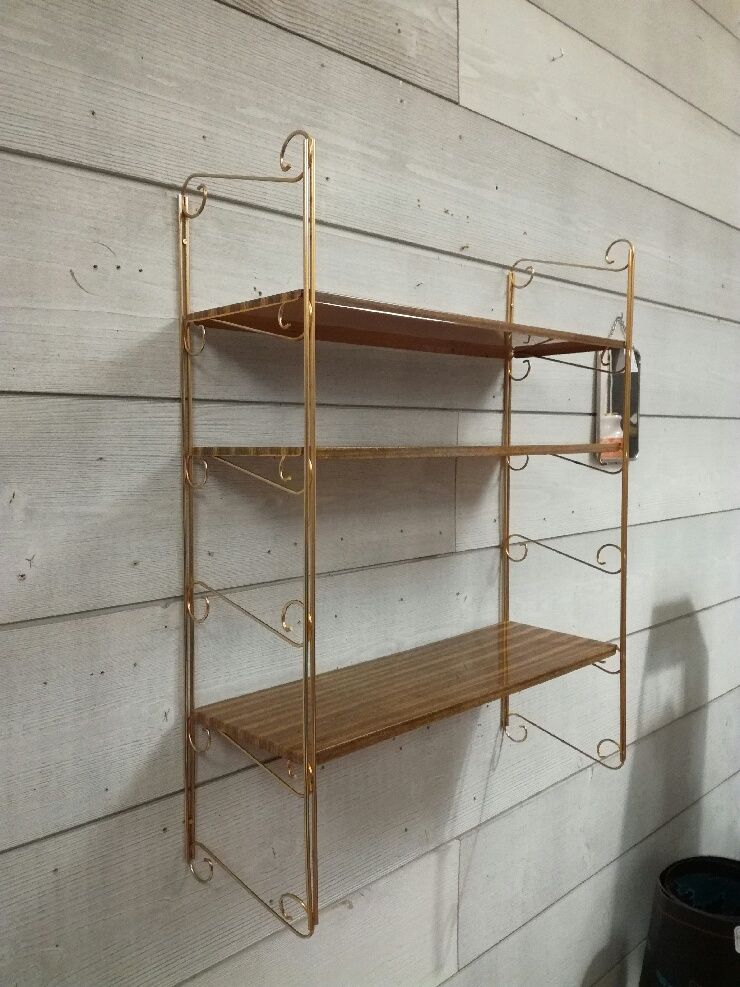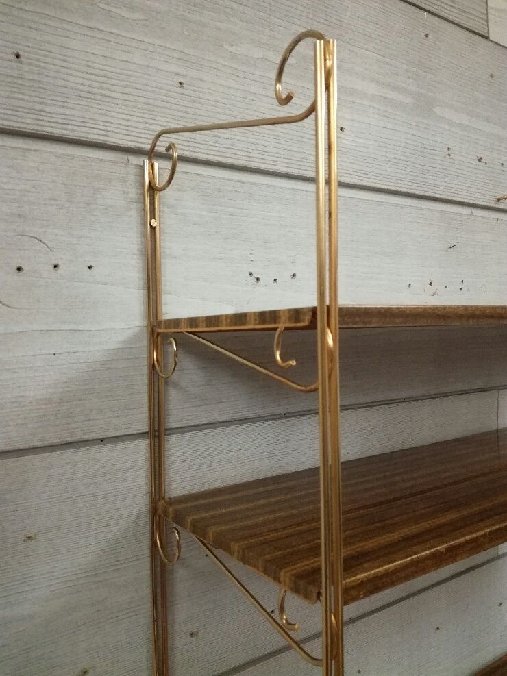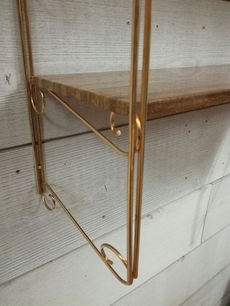 Composé ici de deux montants en métal doré et de trois plateaux en métal plié imitation bois.Quelques points de soudure au niveau des décors en volutes (très peu visible)