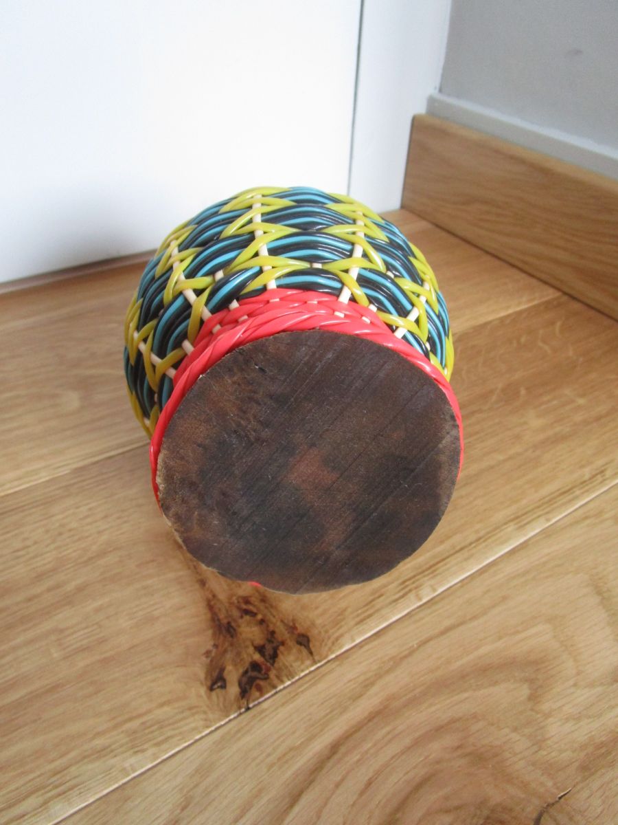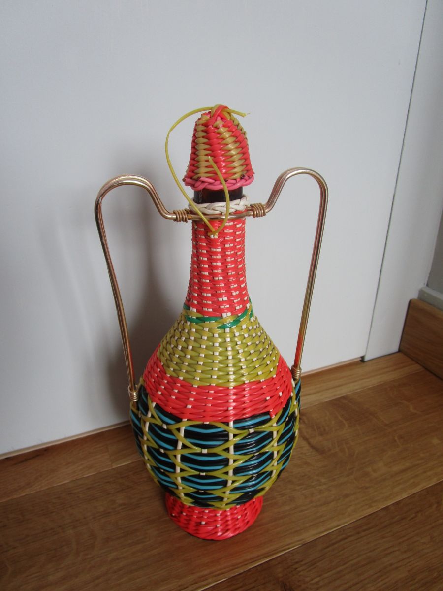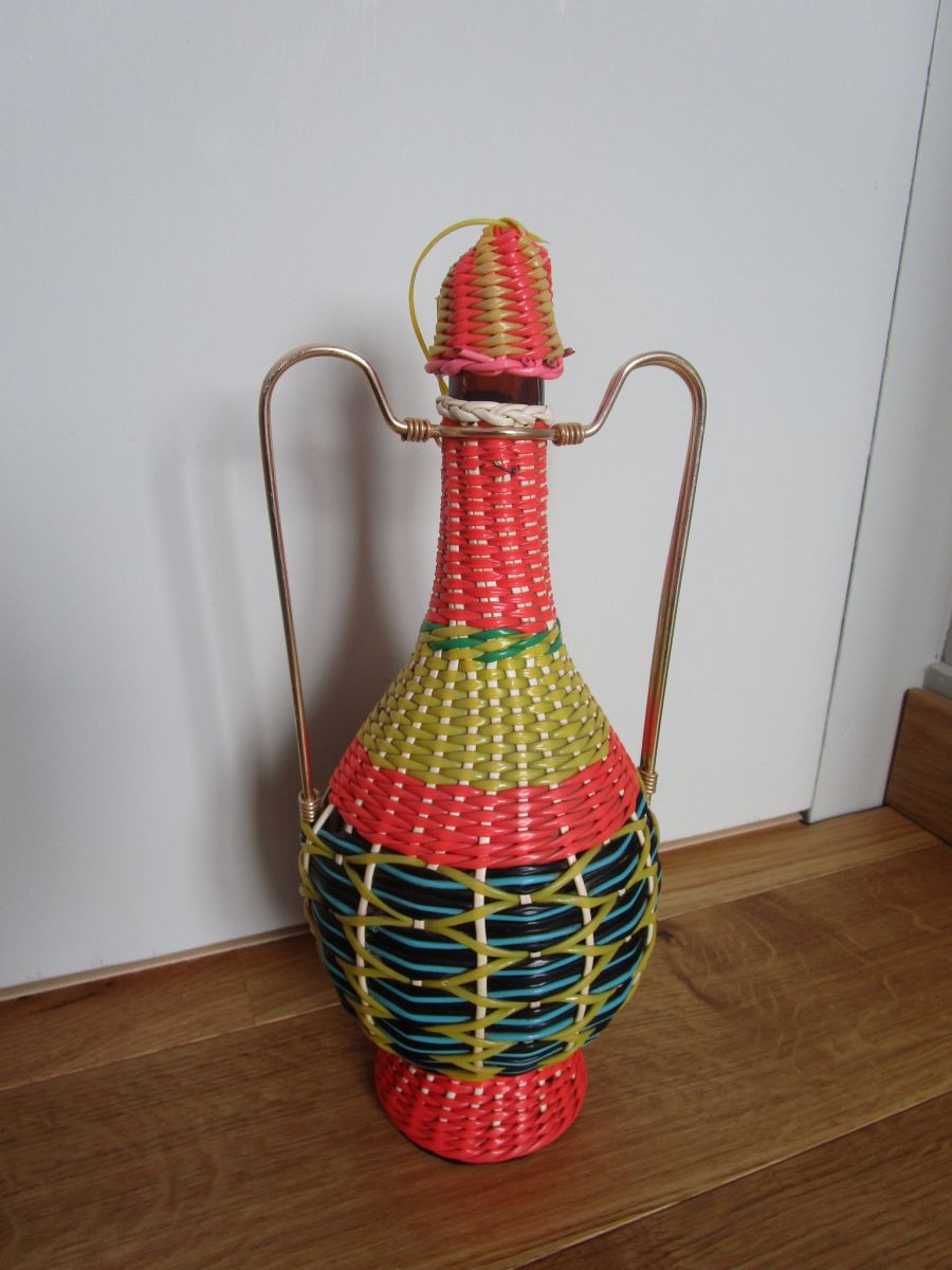 Jolie bouteille en verre brun, recouverte de fils « scoubidou » tressés, de couleurs flashy ( rose orangé, jaune, bleu ciel, noir, blanc, rose et vert). Elle doit dater des années 60 ou 70. Elle est originale avec sa forme d'amphore et ses anses en métal doré. Le bouchon est présent, mais la partie en liège, à l'intérieur, est cassée. De plus, le fil qui relie le bouchon au corps est coupé, mais on peut simplement retirer ce fil, cela n’enlève rien au charme vintage de cette bouteille. Hormis ces deux détails, elle est en bon état. Elle mesure 33 cm de haut (bouchon compris), et environ 14 cm de diamètre maximal (au niveau du renflement). Elle pèse 900 g environ.