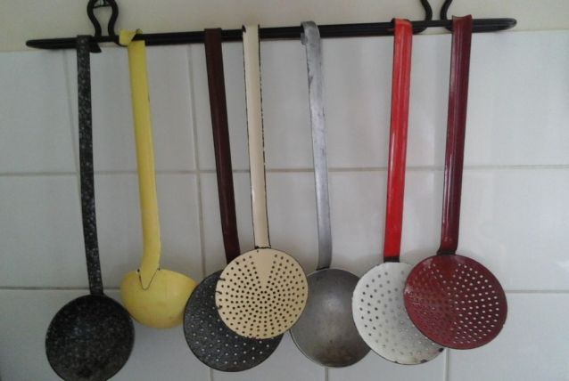 Lot de 7 louches, écumoires anciennes en métal émaillé.