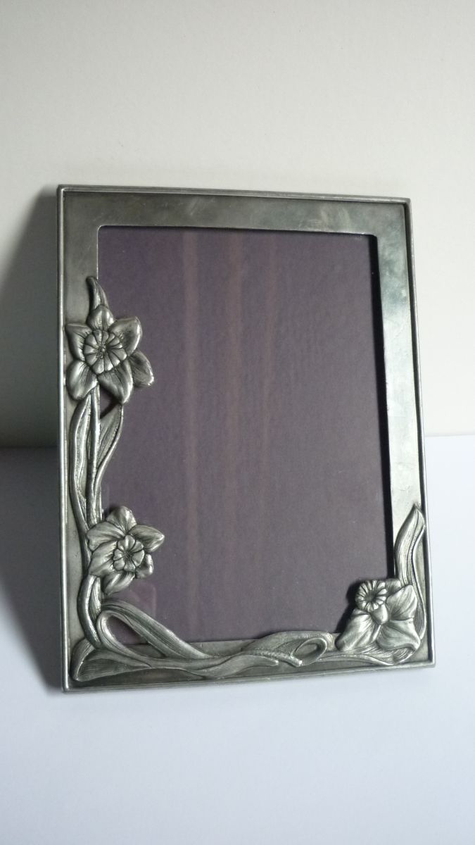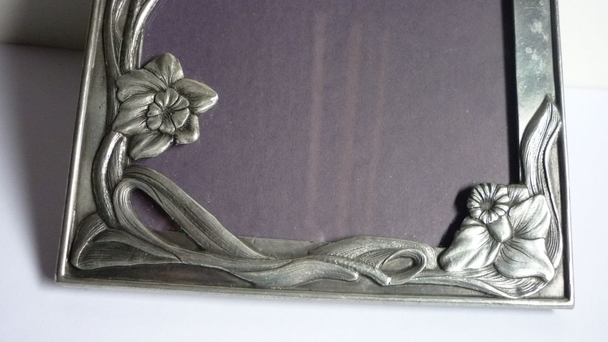 Ravissant cadre photo en métal dont le décor rappelle le style art nouveau, avec ces volutes et ces fleurs.