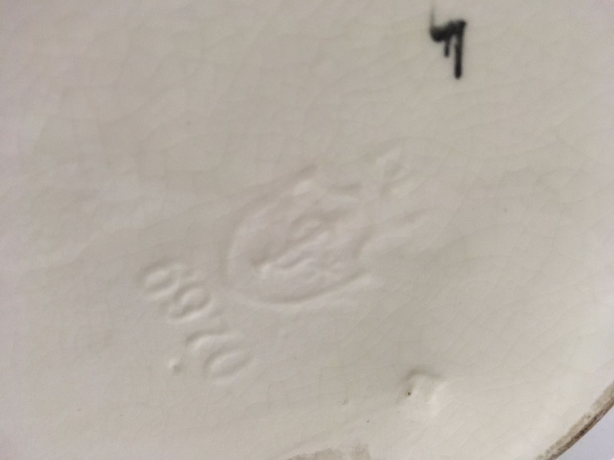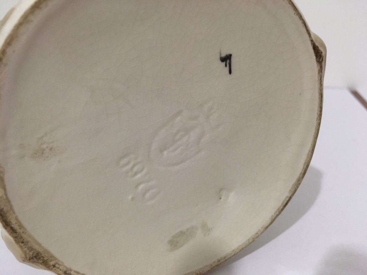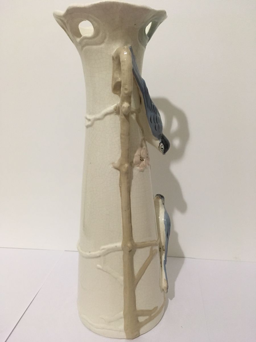Vase de forme très élancée. En relief : 2 mésanges bleues sur branchages formant anses. Fleurs roses pâles. collerette ouvragée. L'un des oiseaux a une aile cassée. H31 x L11 x P11