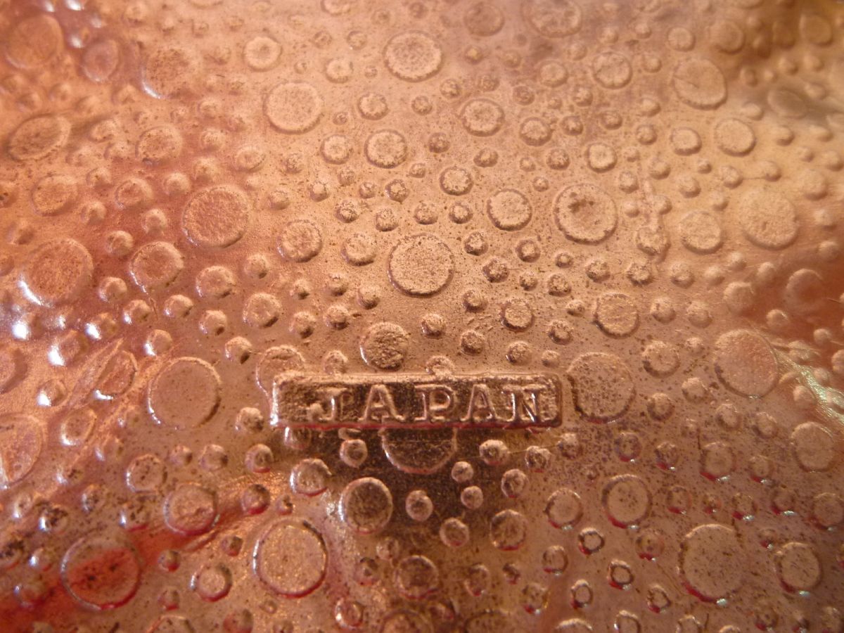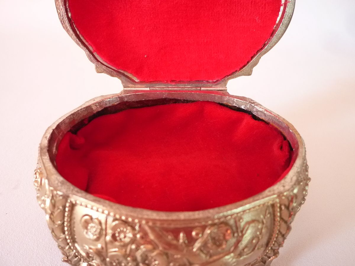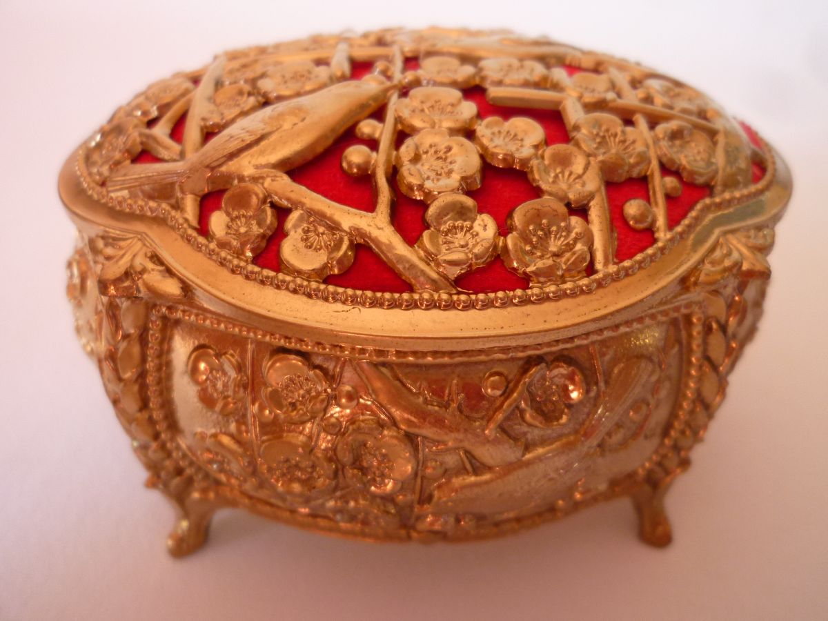 Petite boite à bijoux vintage en métal doré sur pieds à décor d'oiseaux et de fleurs de cerisiers sur toutes les faces. Décor ajouré doublé de velours rouge sur l'ouverture et métal plein sur le corps de la boite. D'origine japonaise, simple et raffinée. velours rouge à l'intérieur. Excellent état