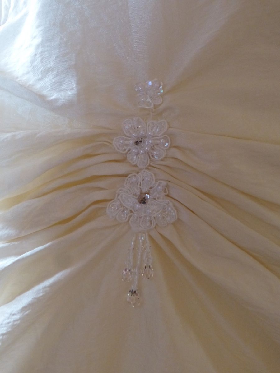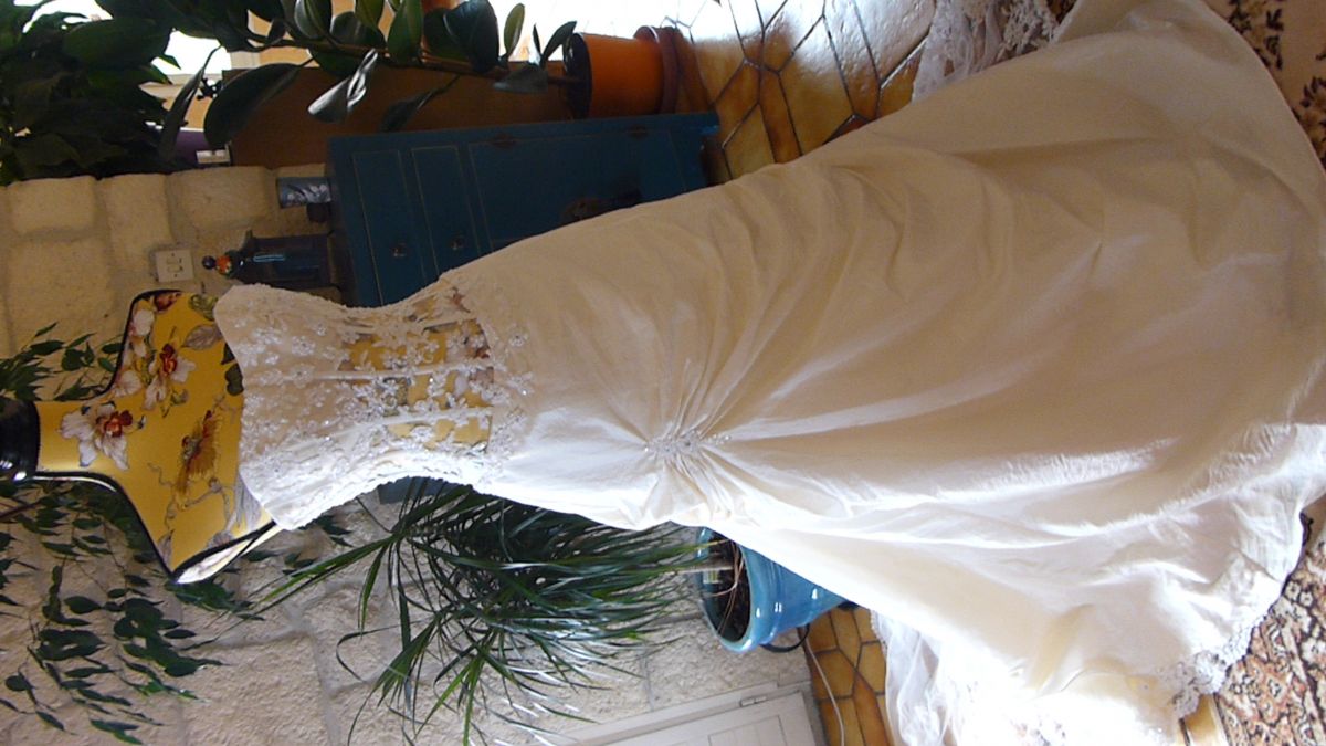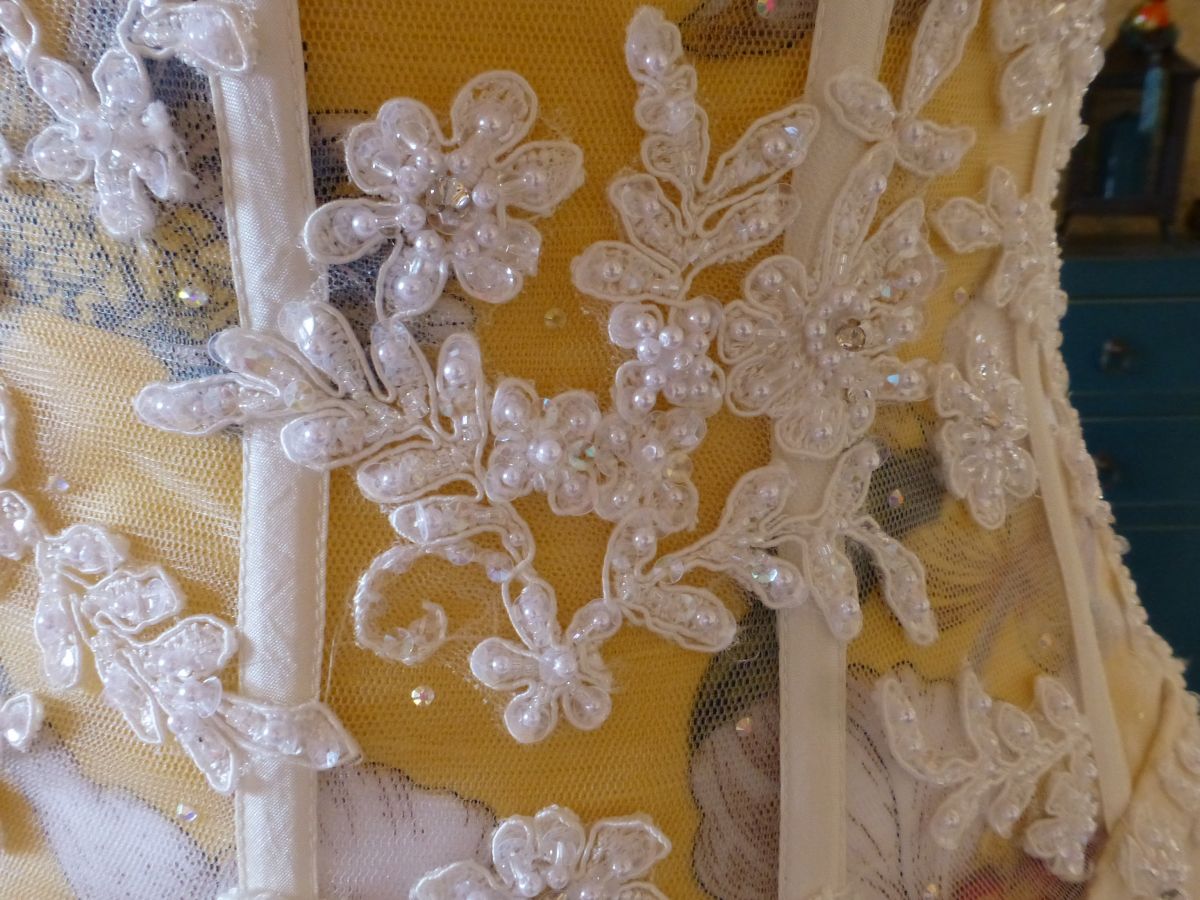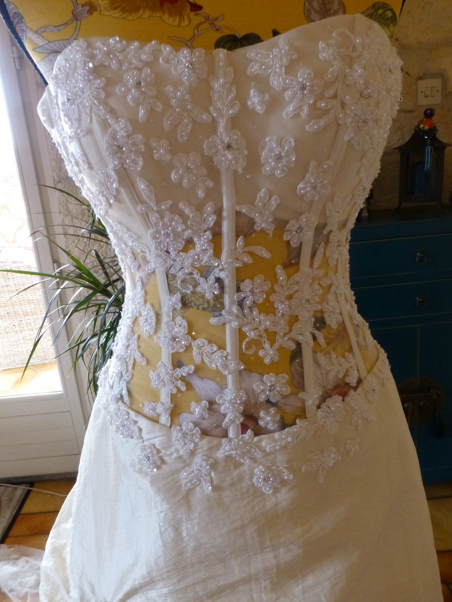 C'est le seul exemplaire disponible en France. Corset transparent au niveau du ventre, il est décoré de dentelle rebrodée de perles. Jupe en taffetas qui s'évase en traine qui reprend la dentelle du corset. Robe de grande qualité avec de très beaux détails. Cette robe est neuve et n'a aucun défaut.