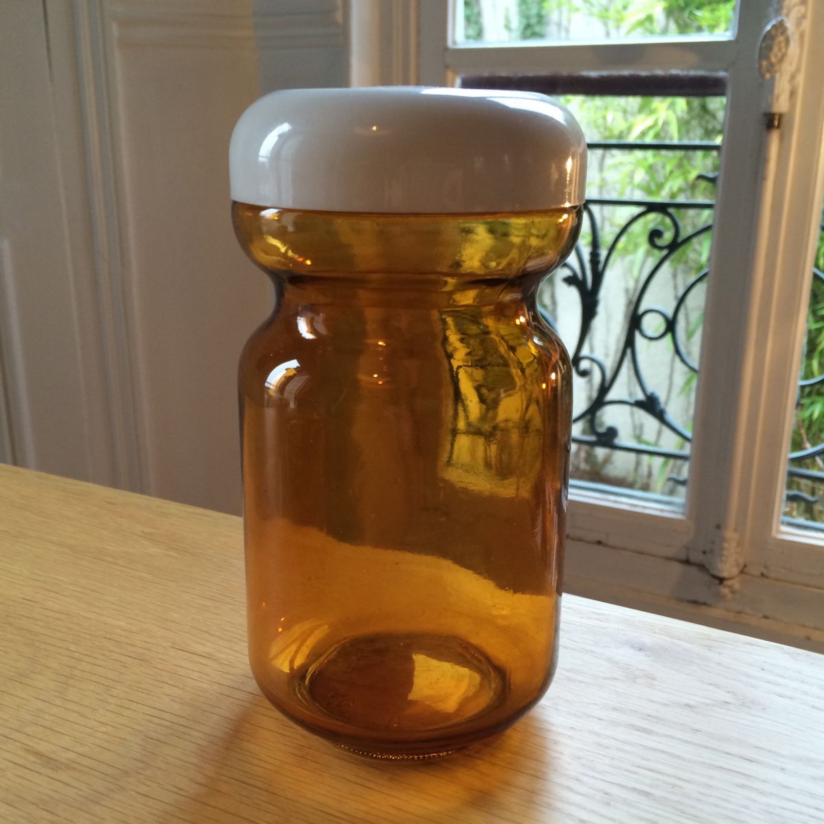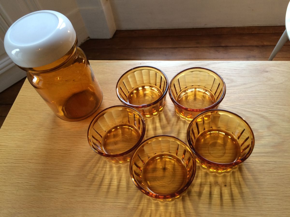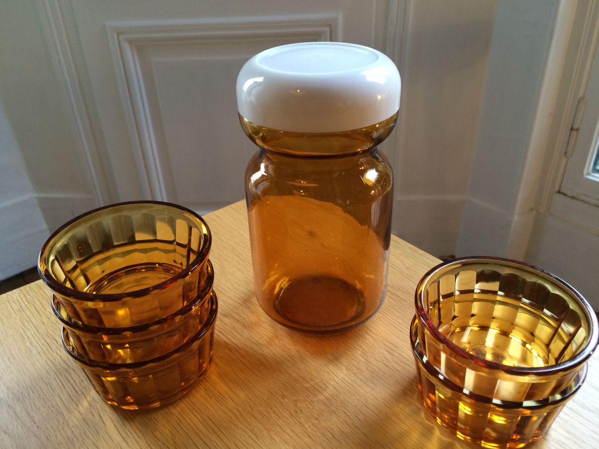 Bocal de conservation 7O avec bouchon en plastic vissé et 5 coupelles caramel assorties, ensemble complètement vintage.