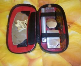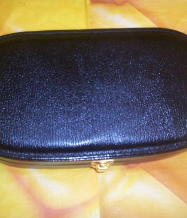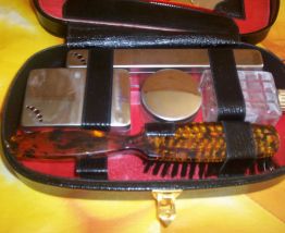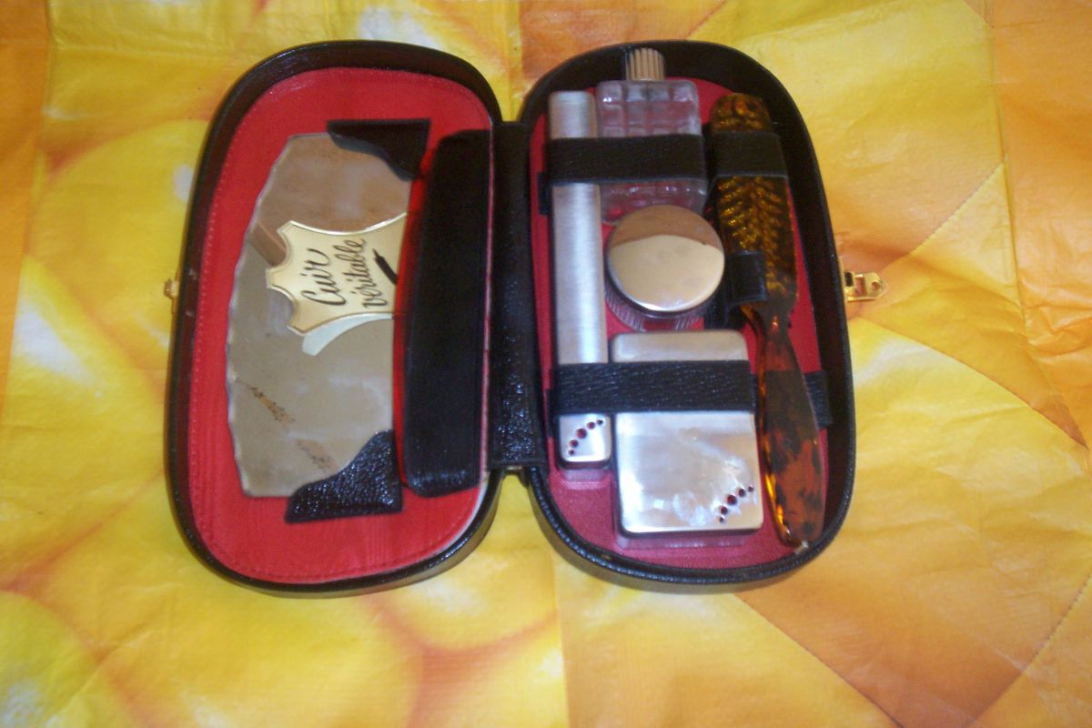 trousse de toilette de voyage pour homme en cuir noir d'occasion en excellent état propre avec glace peigne boite a savon boite pour brosse a dent boite pour creme flacon pour eau de cologne et brosse a chaussure .