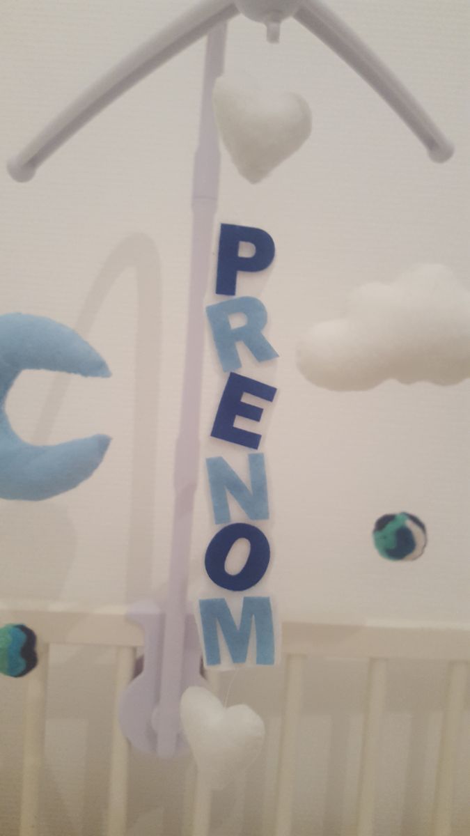 - prénom de l'enfant suspendu au milieu en alternant lettre bleu marine et bleu clair sur tissu feutrine blanc entre 2 petits coeur en feutrine blanc rembouré