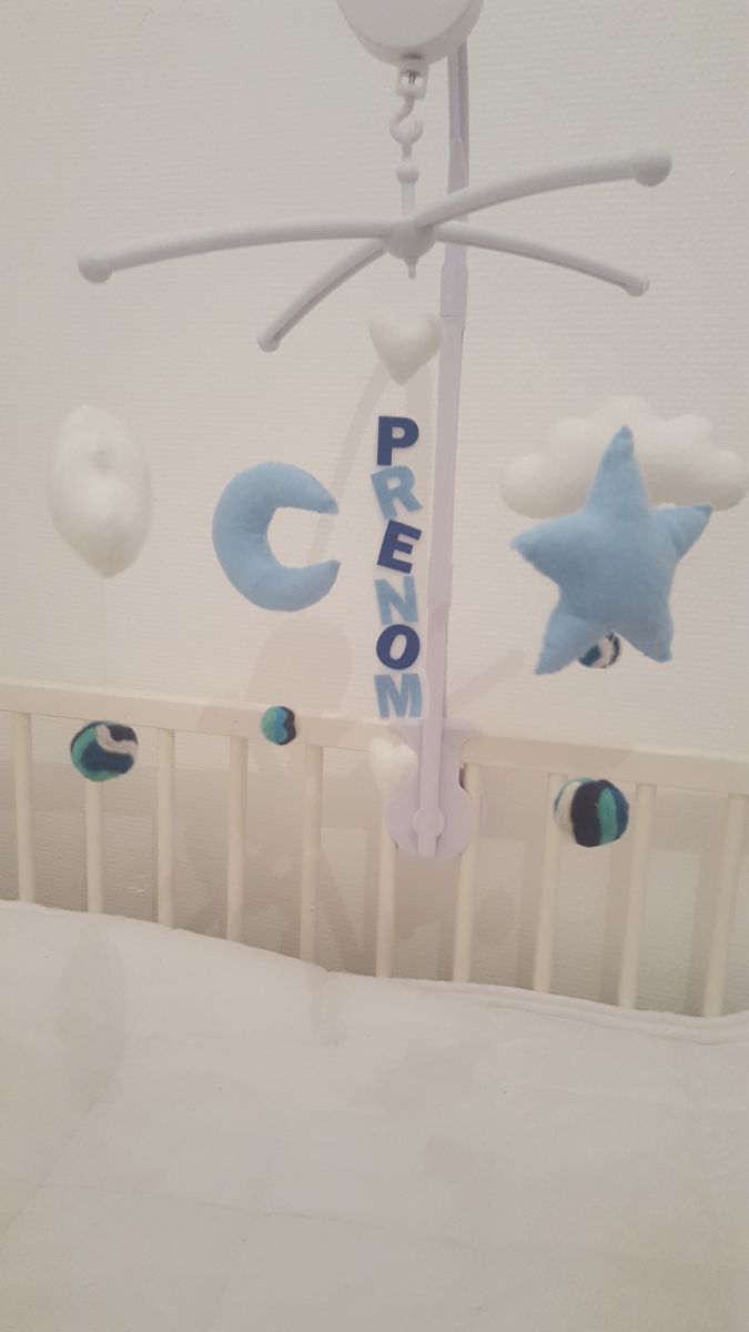 Indispensable du trousseau de naissance, un mobile musical bleu pastel et blanc plein de tendresse et de douceur.