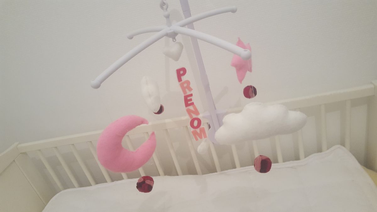 Indispensable du trousseau de naissance, un mobile musical rose pastel et blanc plein de tendresse et de douceur.