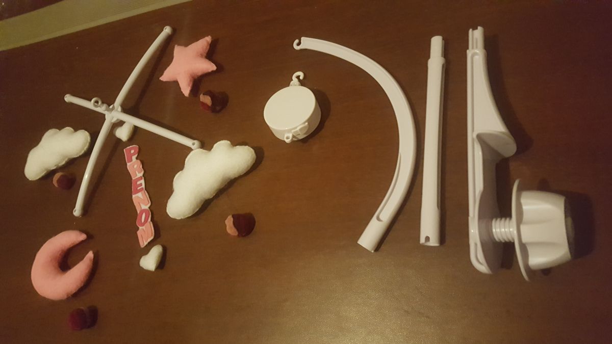 Ce mobile musical est constitué de cinq éléments aux couleurs douces, d'un rose très délicat :