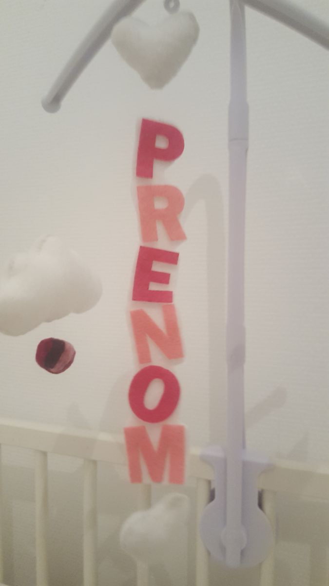 - prénom de l'enfant suspendu au milieu en alternant lettre rose fushia et rose clair sur tissu feutrine blanc
