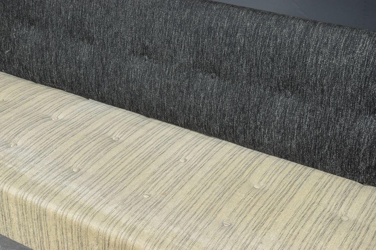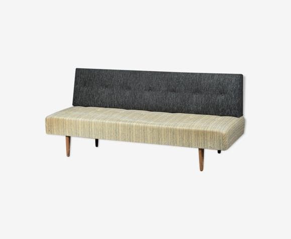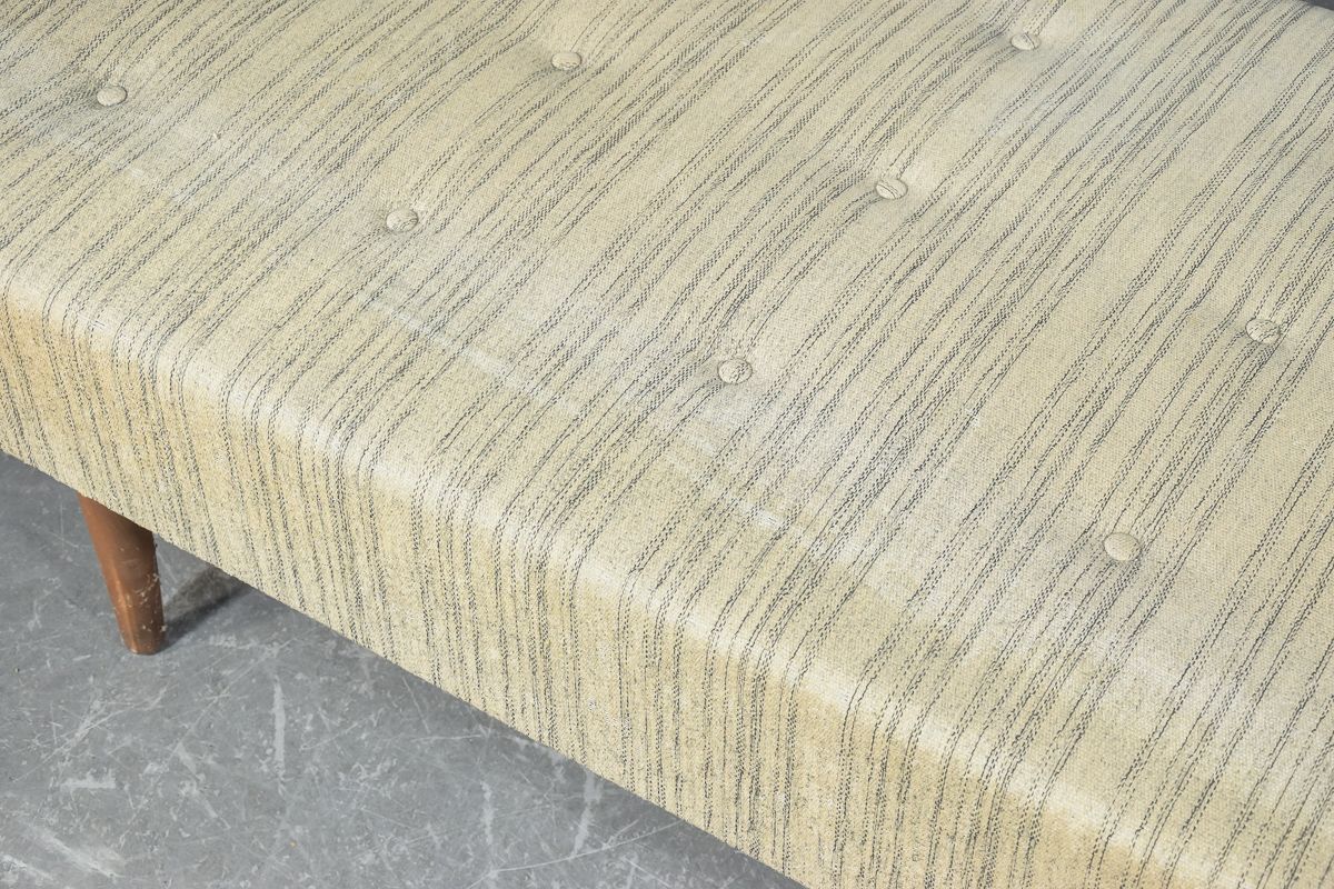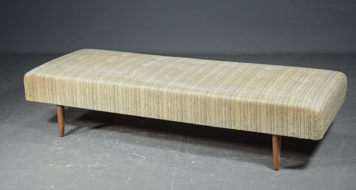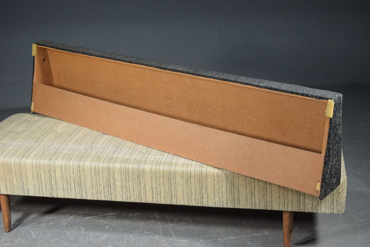 Banquette-lit / canapé convertible avec pieds vissés 1950/1960. Assise recouverte de laine rayée, et dossier séparé recouvert de laine noire chinée, tous deux cousus bout à bout. Traces d’usure normales pour l’âge, y compris un peu d’usure localisée. H. 40. 74 x 190 cm. Fabricant de meubles danois.