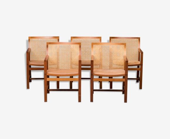 5 fauteuils en acajou de Rud Thygesen et Johnny Sørensen, dos montés avec tresse française, assise garnie en cuir, hauteur assise 43 cm. Créé en 1985 dans le cadre de la série royale. Fabriqué par Botium. Rayures et des marques, des trous et du cuir patiné.