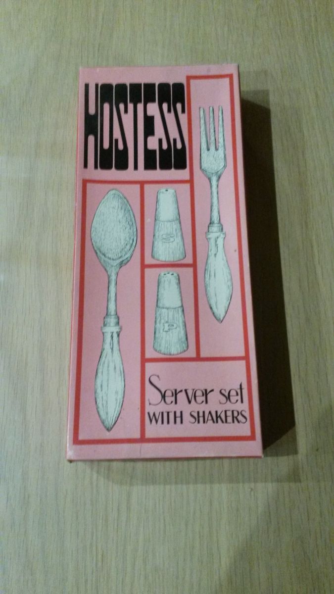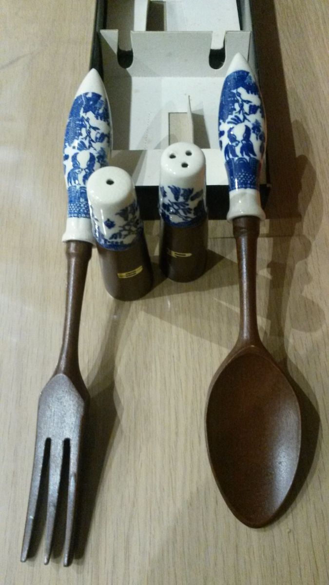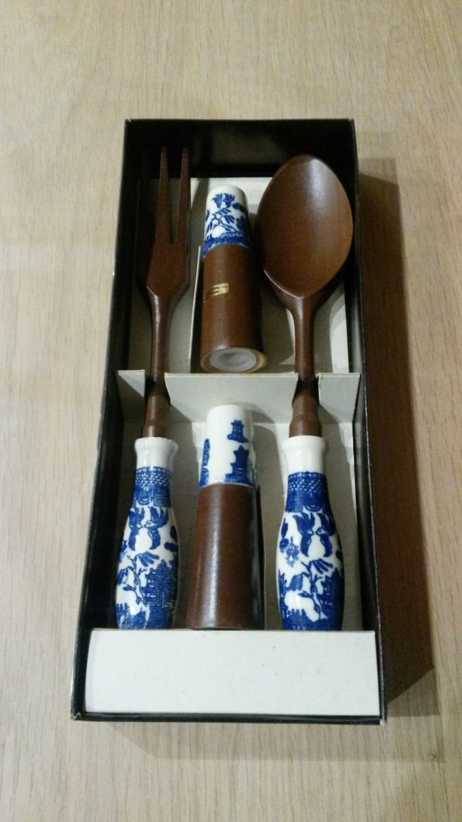 Couverts à salade céramique + bois, salière et poivrière dans leur boite d’origine.