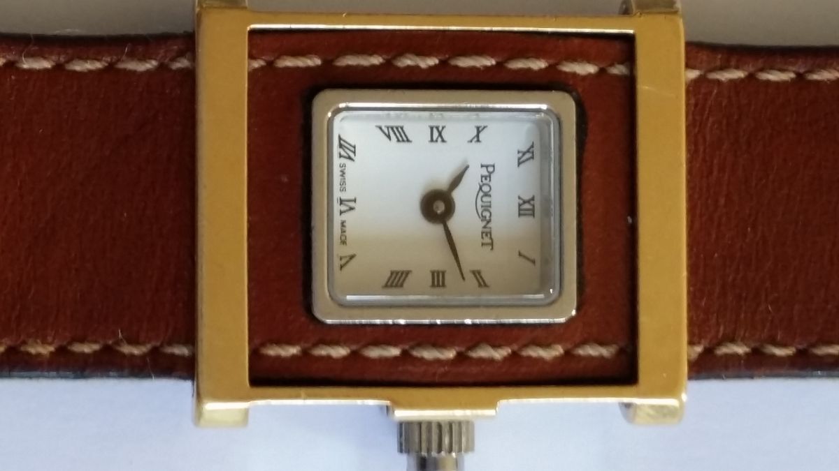 Montre femme de marque Pequignet. Fabrication suisse. Mouvement quartz. Bracelet cuir marron sigle Pequignet. En parfait état de marche. Remise en mains propres sur Nantes et environs (possibilité de livraison dans un rayon de 20 km).