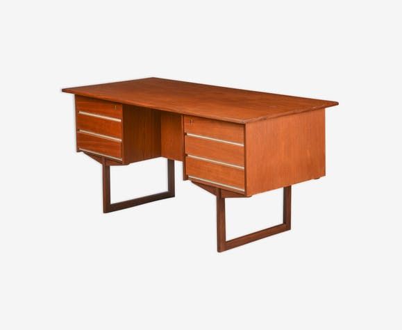 Bureau avec façade en bois de teck plaqué, six tiroirs, l’espace entre les tirroirs a été peint en blanc. H. 72,5 cm. L. 150 cm. B. 70 cm. La clé n’est pas incluse. Présente des traces d’usure.