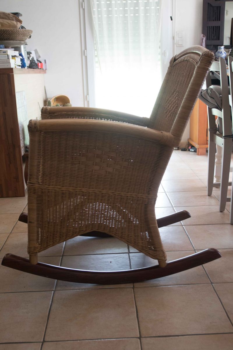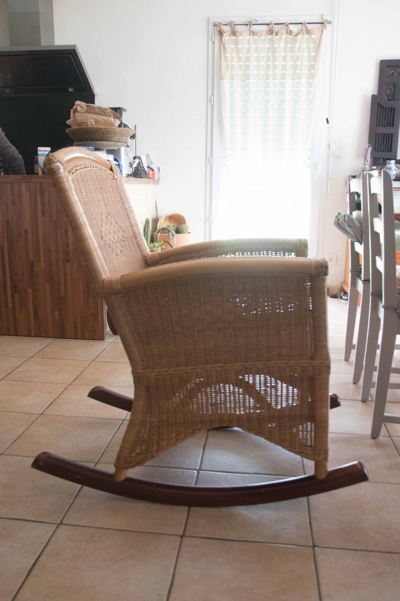 Beau rocking chair en rotin entièrement recouvert (assez rare), avec balancier en bois. Très bon état général on y est très bien assis. Belle couleur miel patinée.