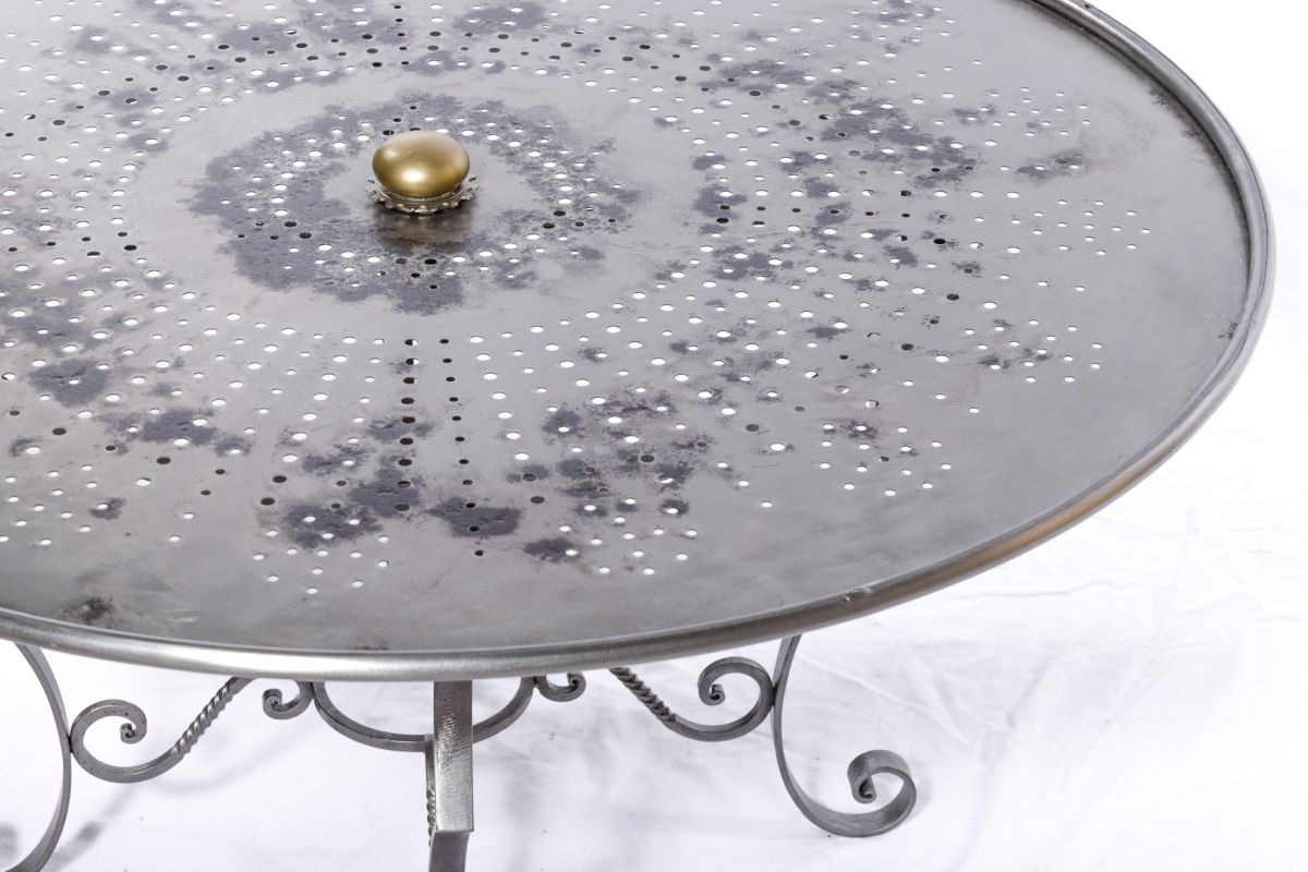 Table basse réalisée à partir d’un piétement en fer forgé et d’un plateau métal de table de jardin retravaillé pour un look industriel. Traitement anti-rouille et double couche de vernis pour une utilisation intérieur ou extérieur.