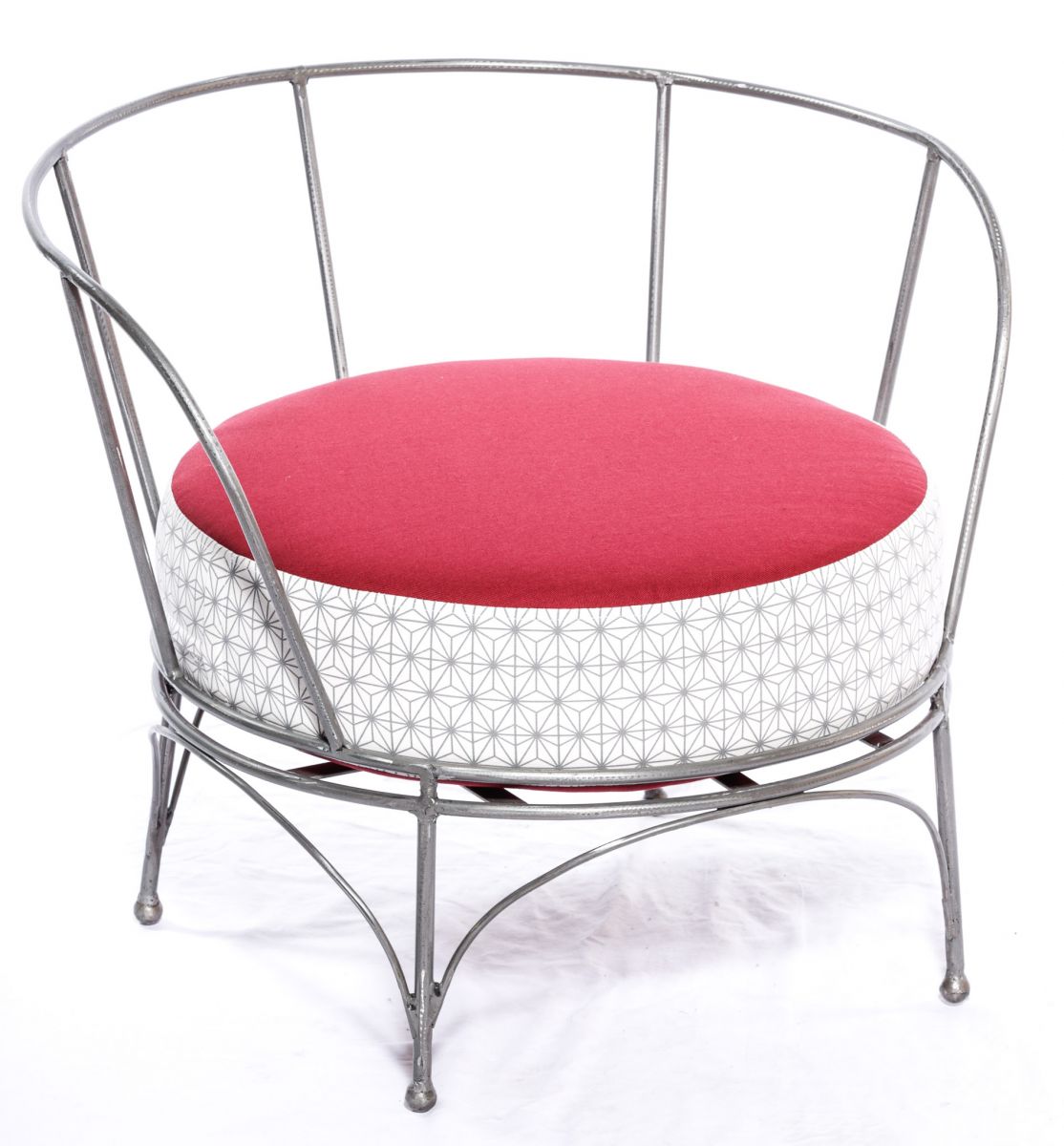 Fauteuil bas en métal retravaillé pour un look industriel et assise entièrement retapissée sur mesure. Traitement anti-rouille et double couche de vernis pour un usage intérieur ou extérieur.
