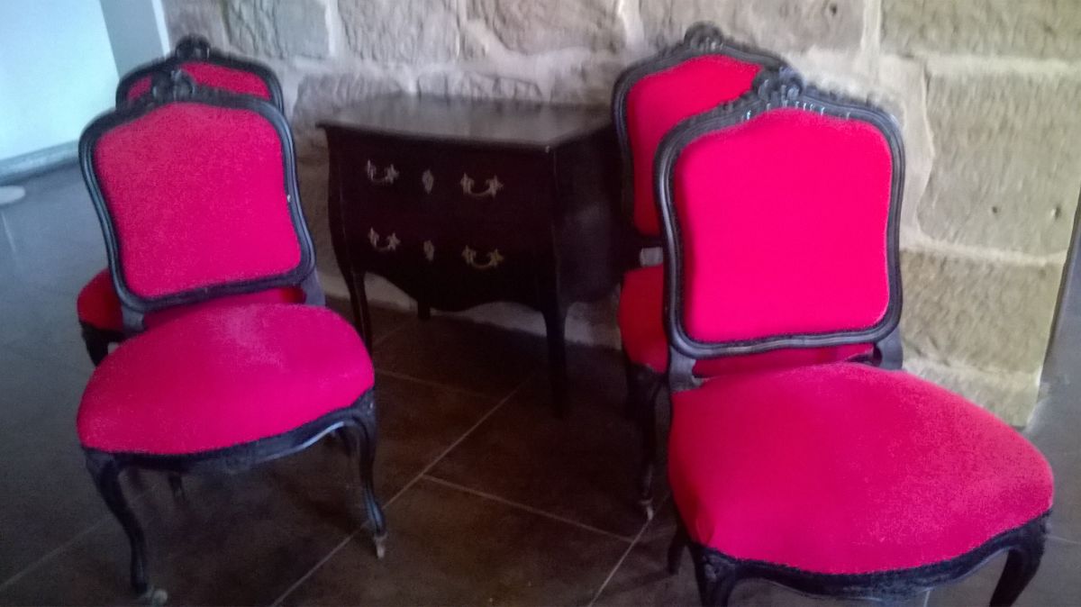 Lot de 4 chaises anciennes totalement restaurées à l'identique par un tapissier .Tissu velours rouge garance,galons à sequins,piètement à roulettes à l'avant, bois fruitier .