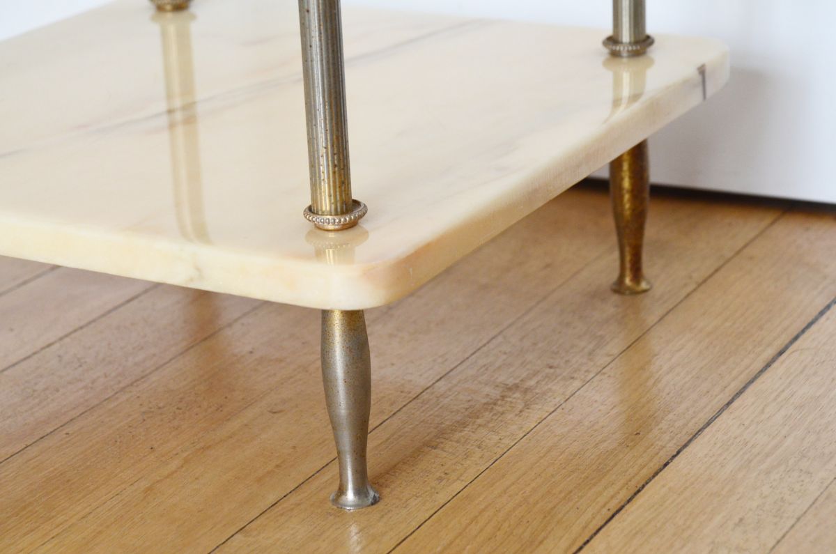 Jolie table de chevet / guéridon à deux plateaux de marbre écru, structure en métal doré patiné argenté.
