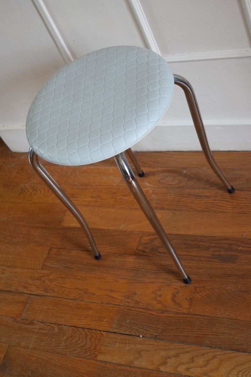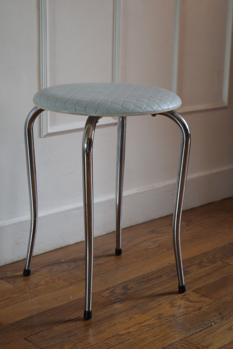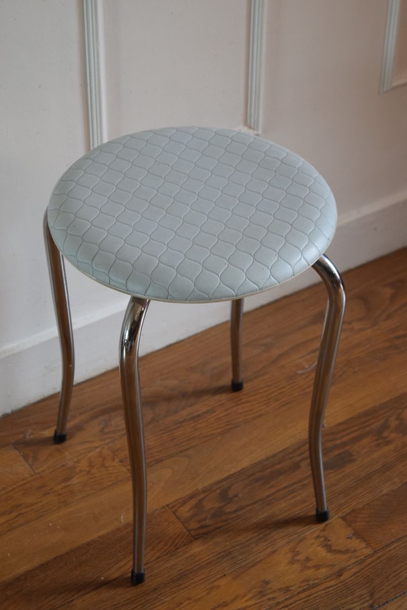 Tabouret vintage des années 70, pieds en métal, assise en skaï matelassé bleu pastel. très tendance.