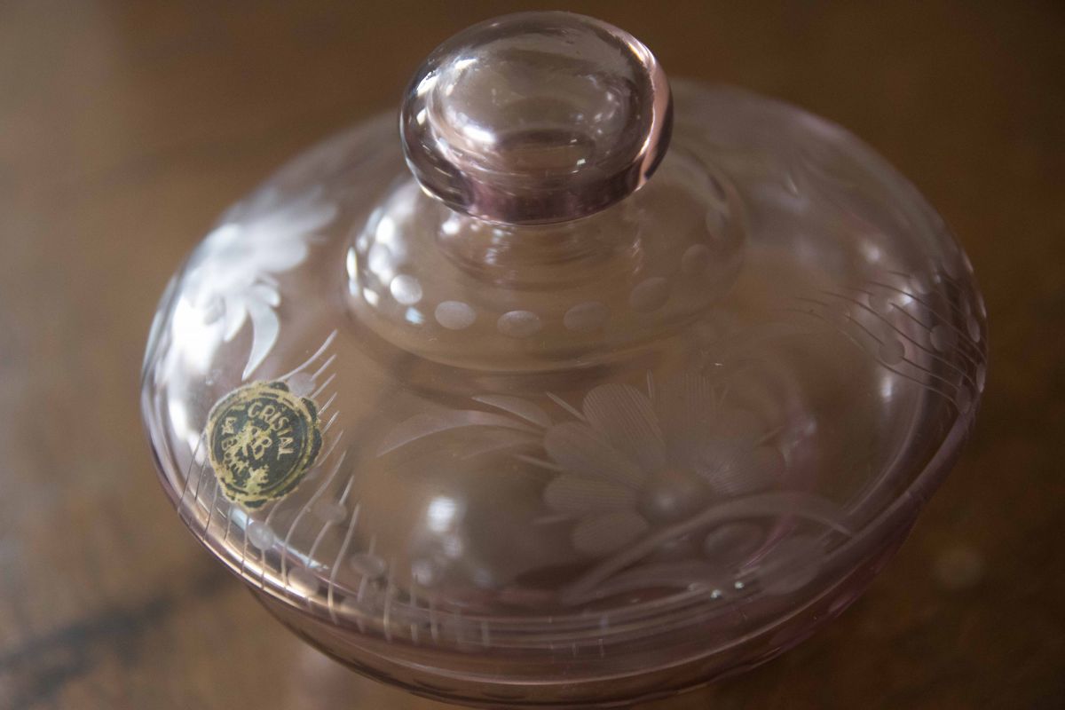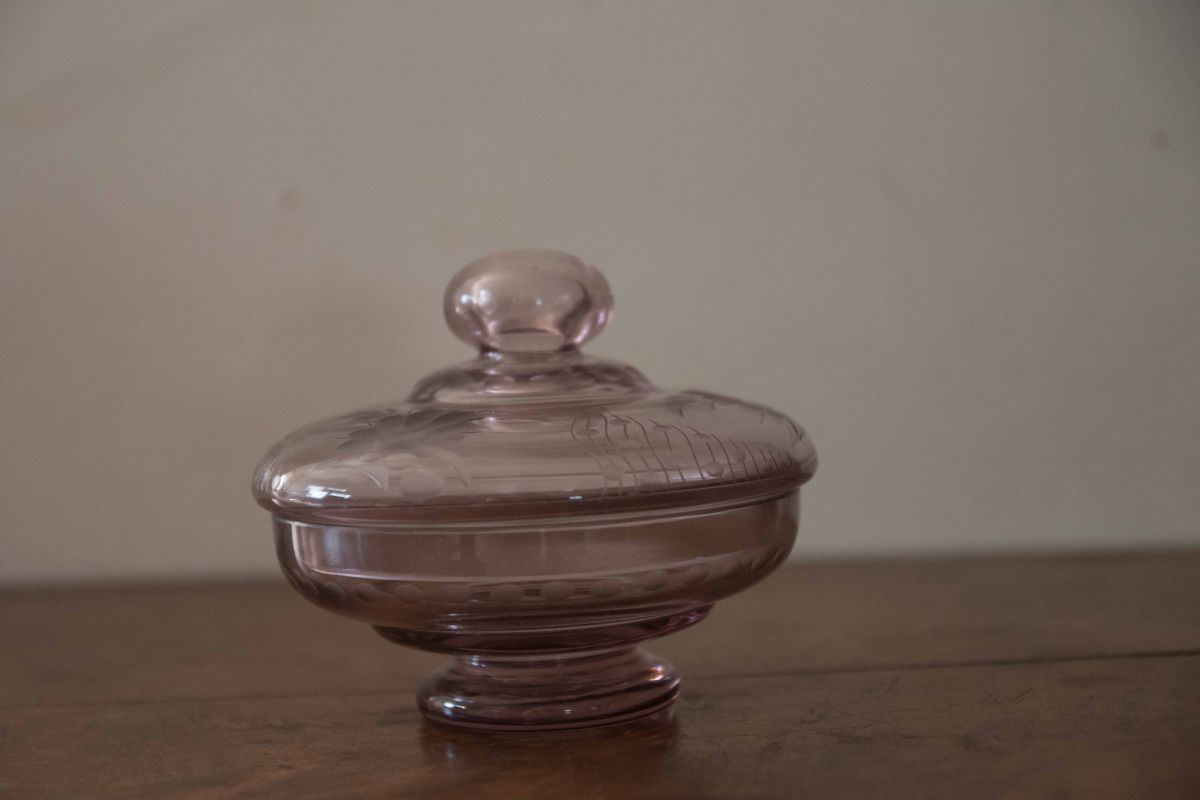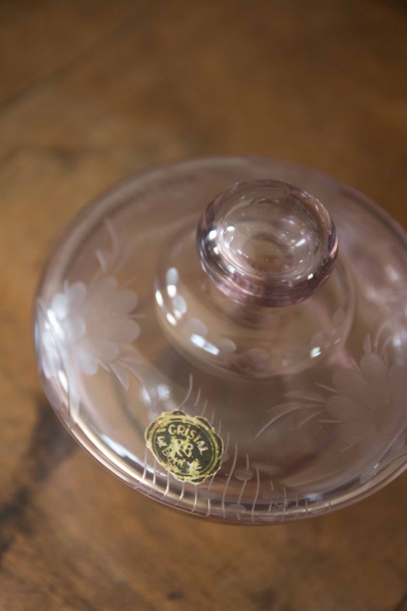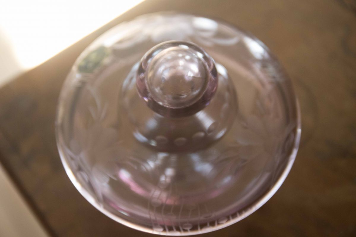 Petite bonbonnière en cristal de bohème taillé aux tons parme. Pièce tout à fait délicate, au décor de fleurs et motifs végétaux, bel objet de vitrine ou d'usage. 450gr