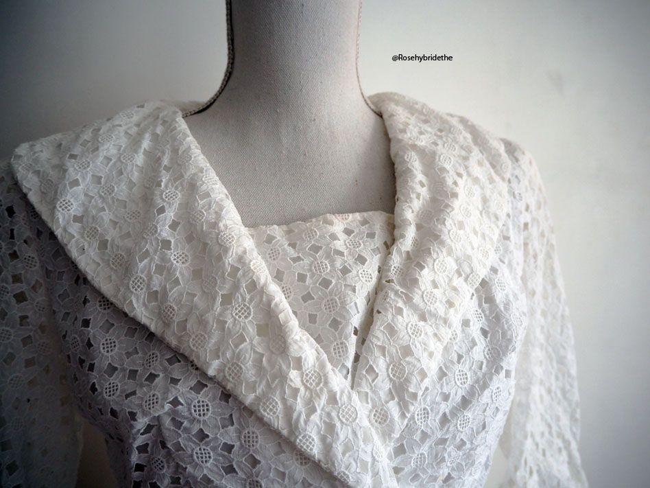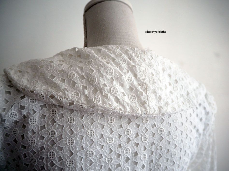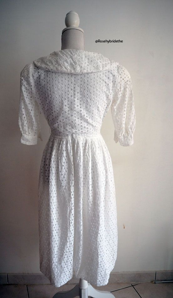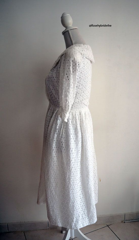 La robe est en broderie anglaise blanche ajourée. Elle est doublée sauf aux manches.