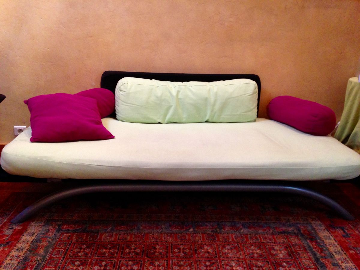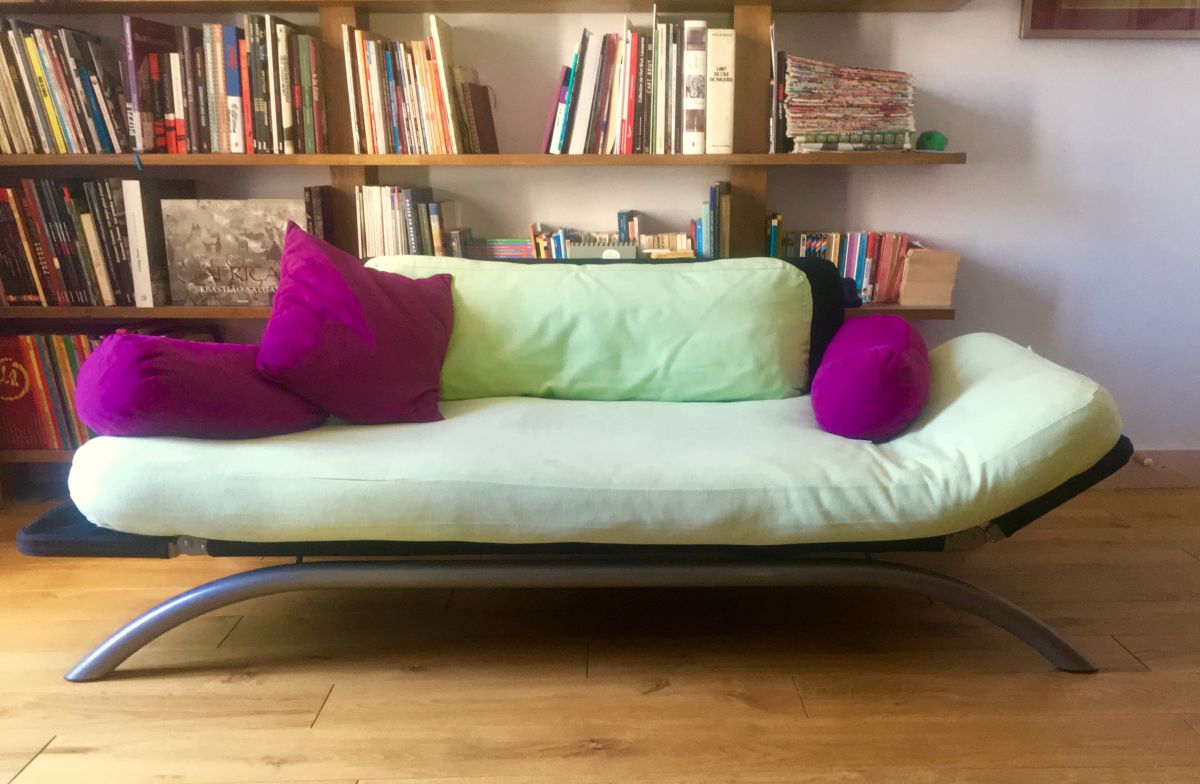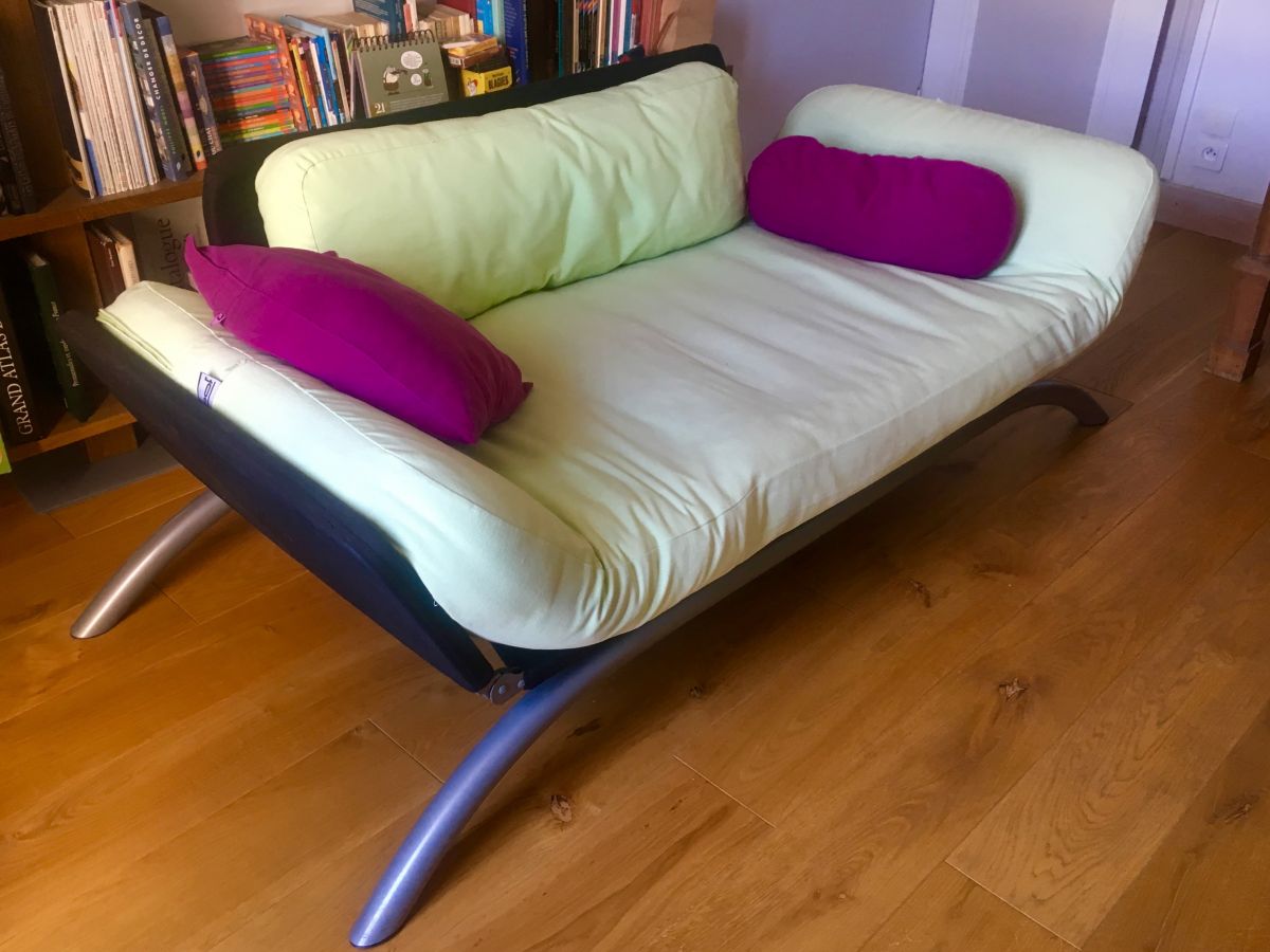Canapé deux côtés relevables, peut servir de lit une place.