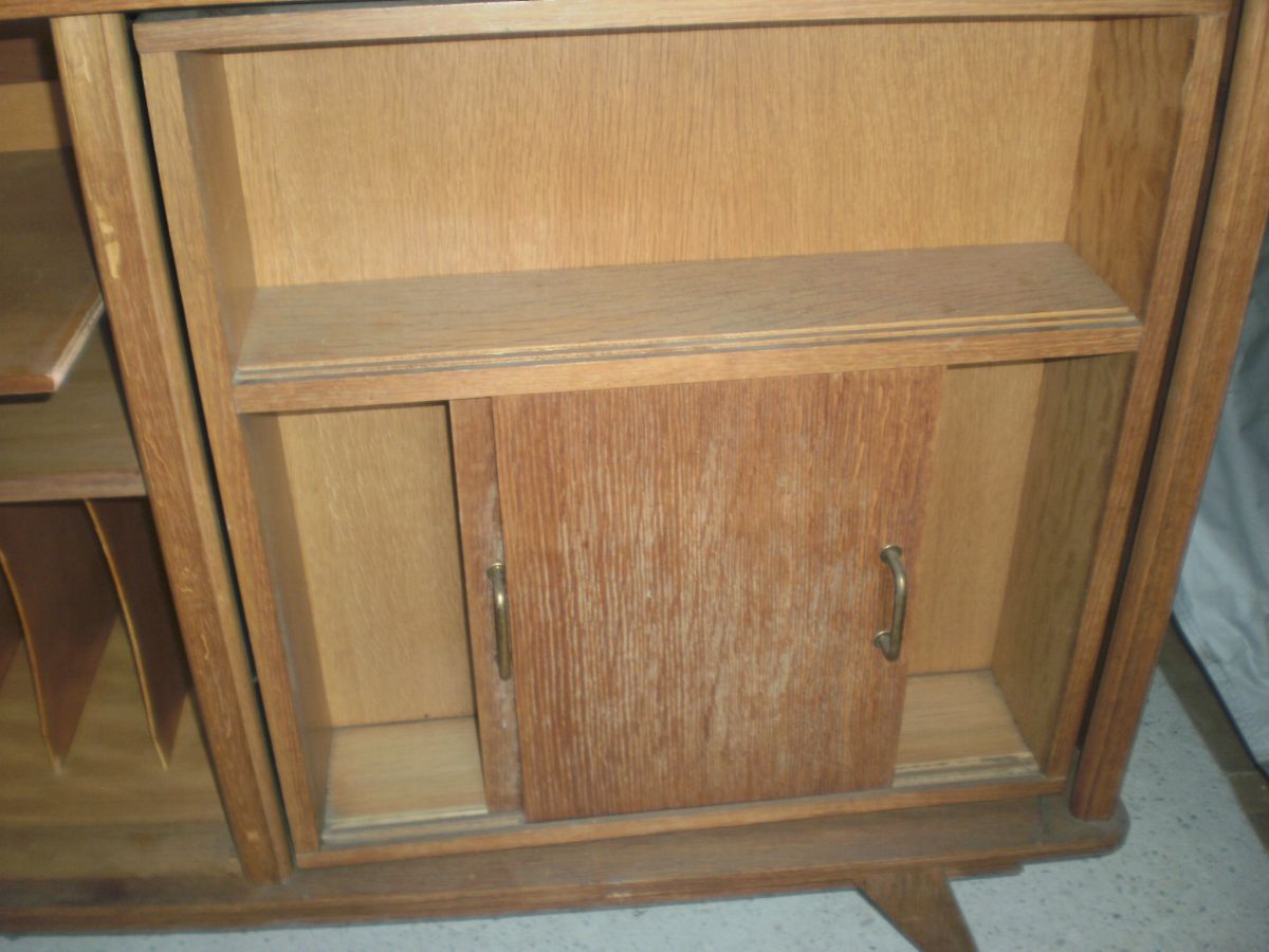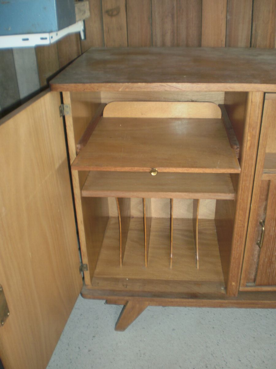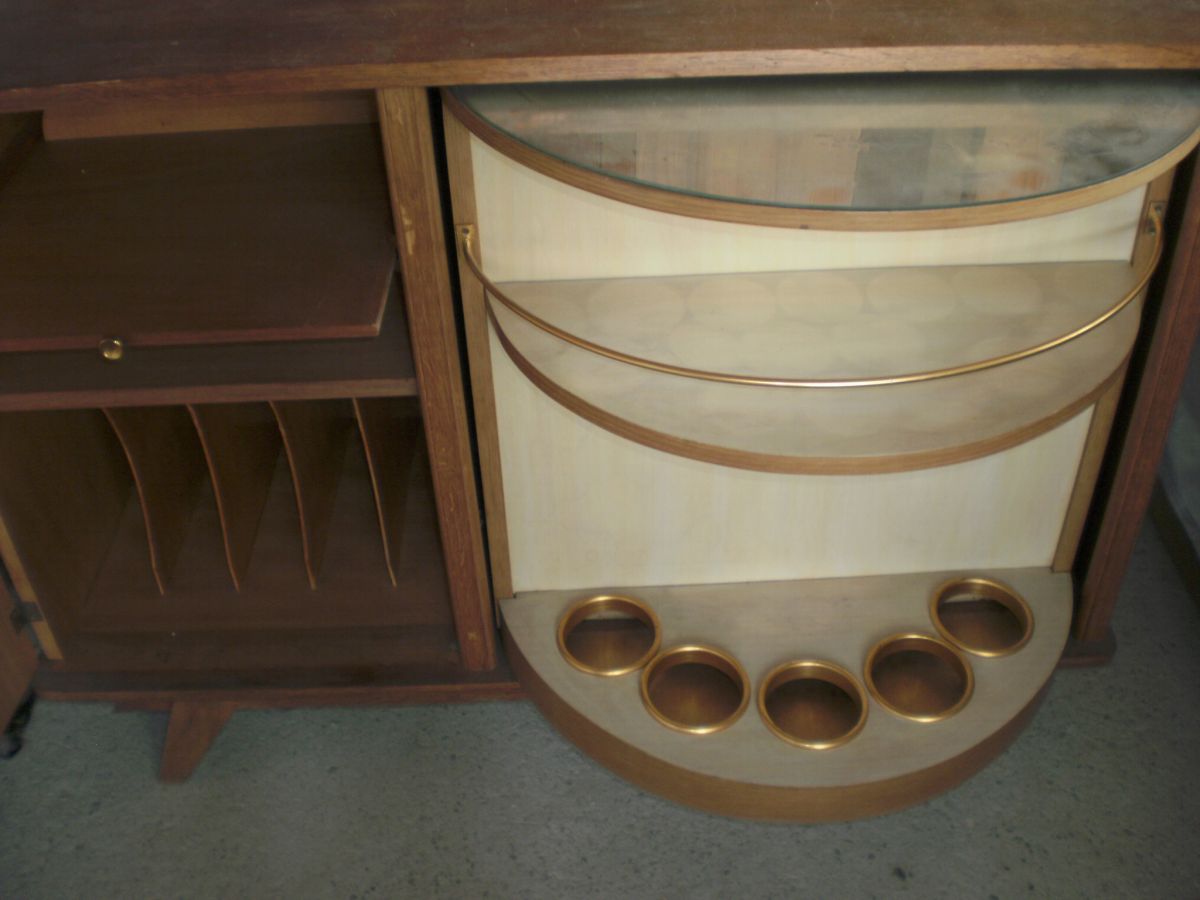 Meuble bar des années 1960 (L 1.20 X l 0.54 X H 0.87). La partie droite est réservée au rangement des bouteilles et des verres, la partie gauche est réservée à un tourne disque avec rangement des disques.