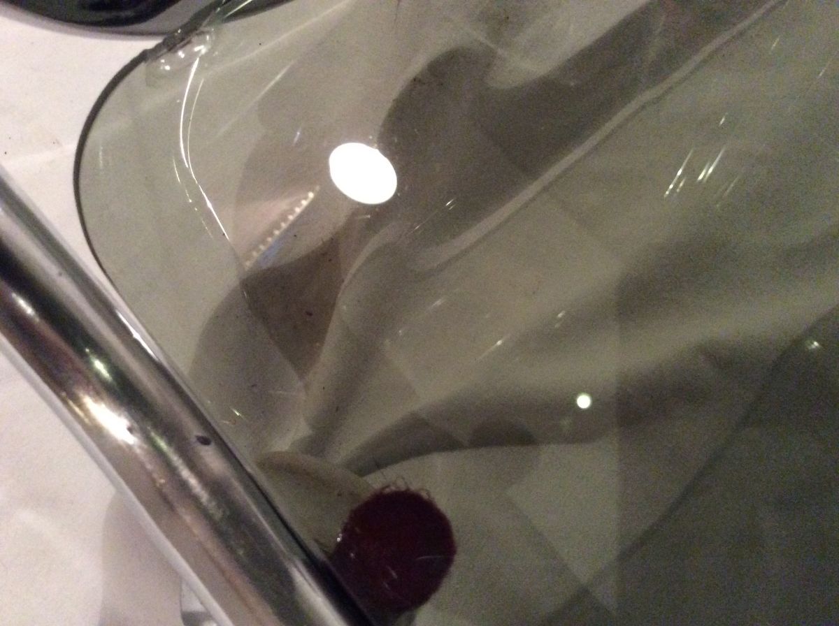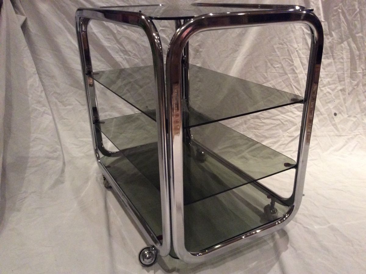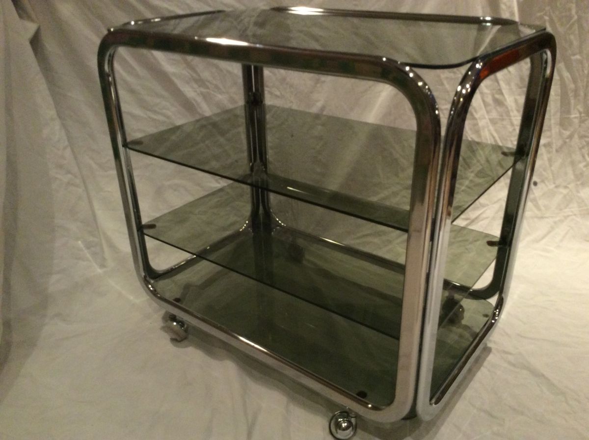 4 plaques en verre démontable reposant sur des pattes en fer recouvertes de feutrine rouge. 4 étages. Roulettes fonctionnant parfaitement. 2 petits éclats sinon bon état général