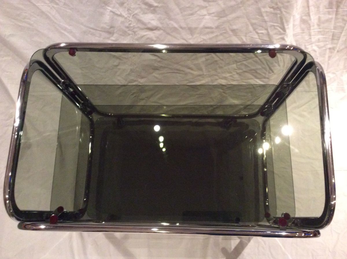 De forme arrondie en métal chromé (métal non piqué) et verre fumé (légèrement noir anthracite)