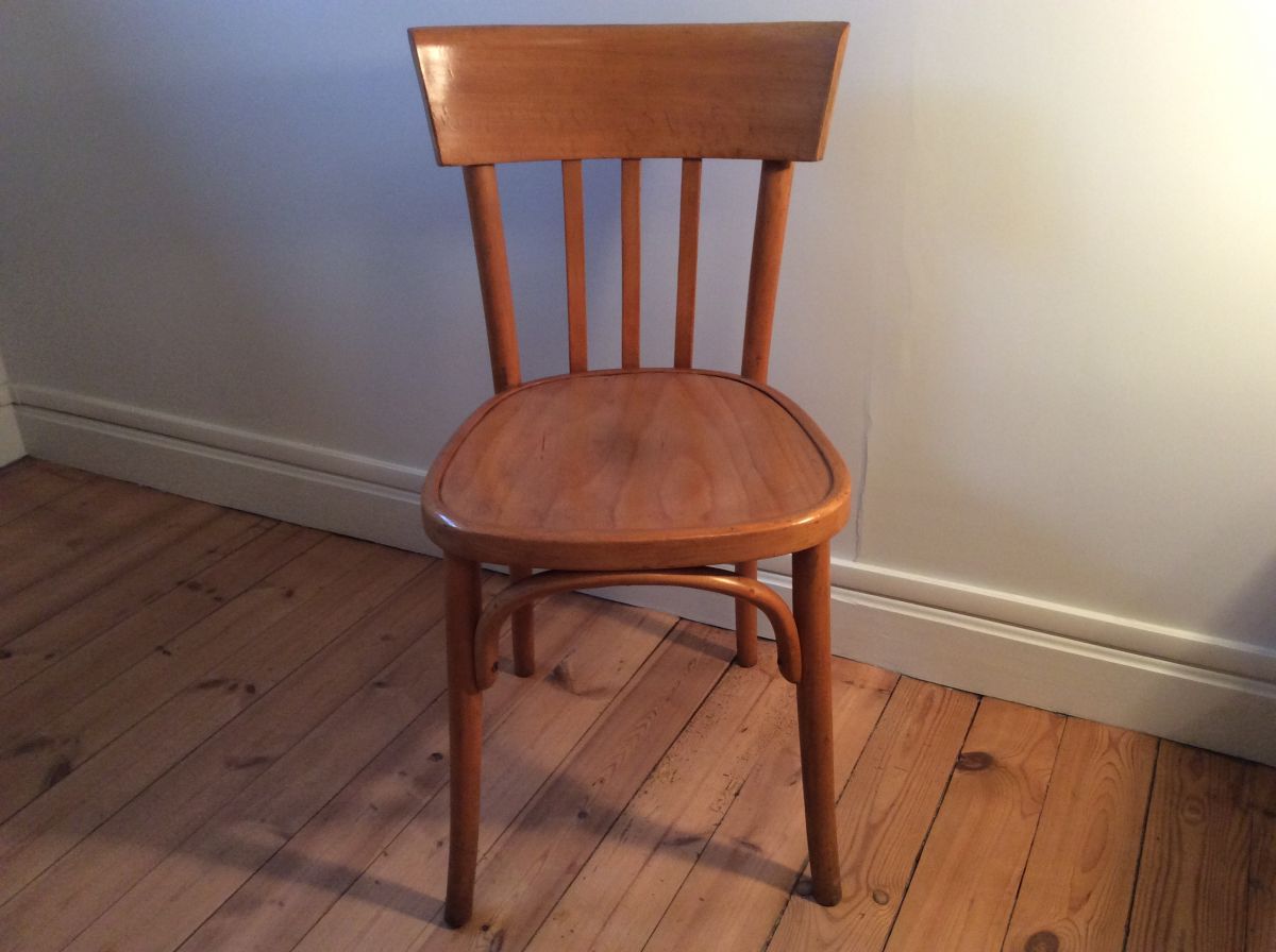 Chaise bistrot années 30 - Célèbre modèle, type Bauman - non signé mais correspondant totalement aux standards et finitions de la marque. Hêtre blond. Très bon état général. Solide et stable. Contreforts courbés sous assise