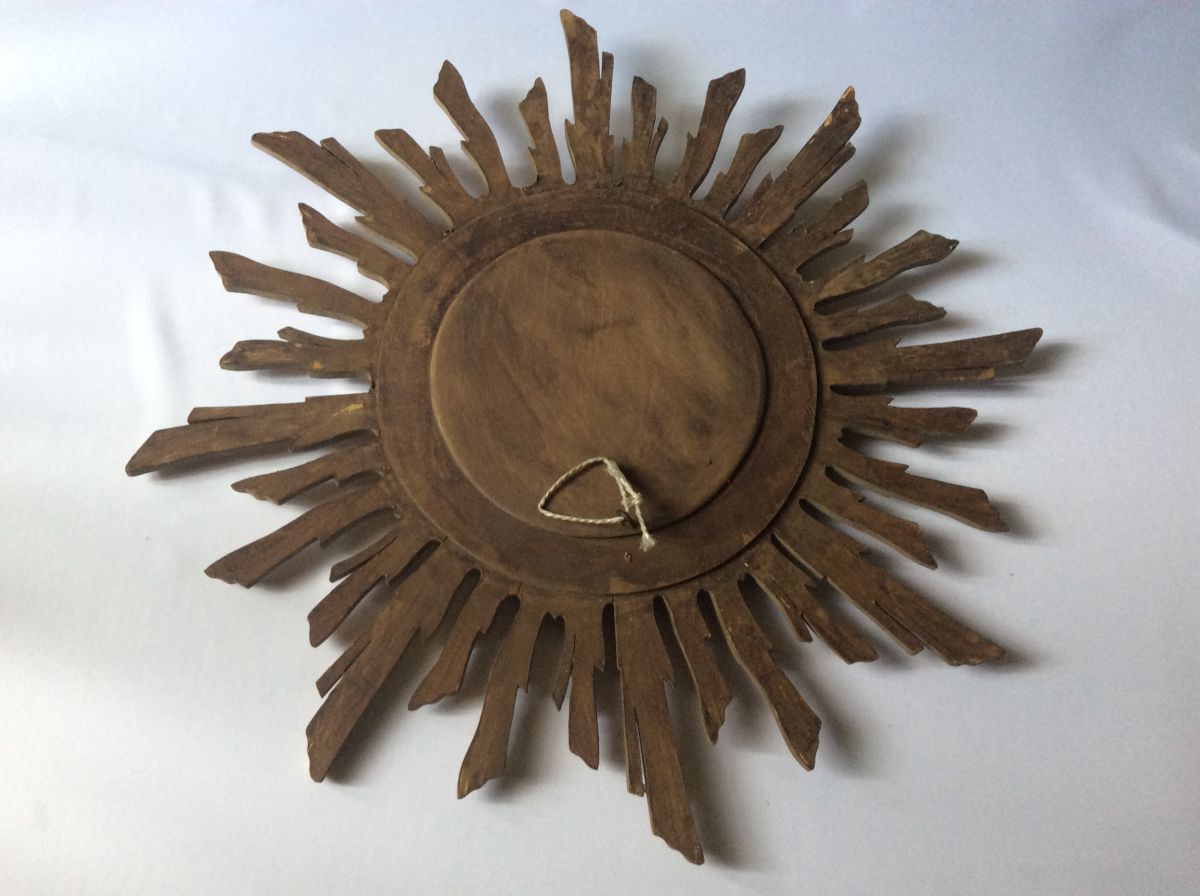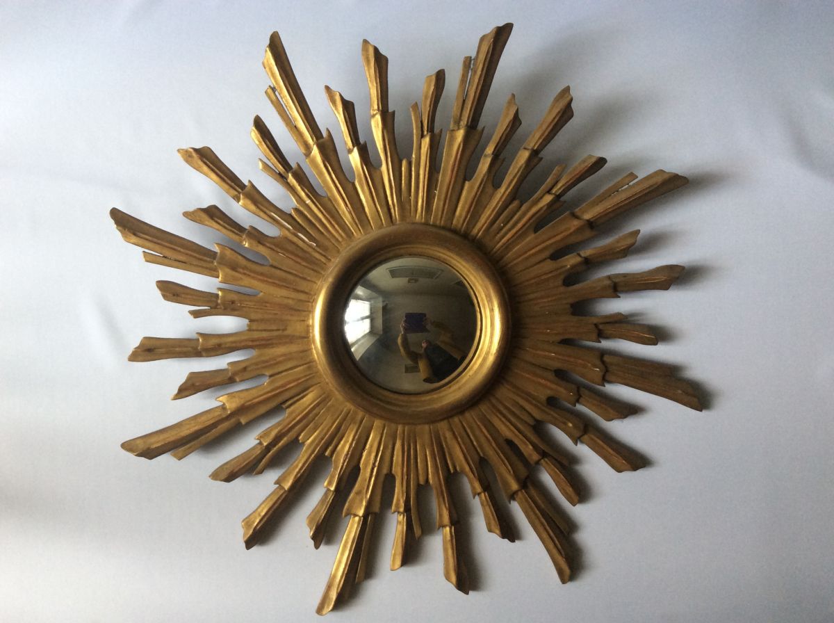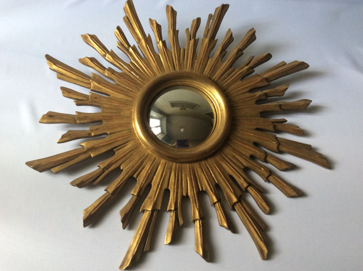 Grand miroir soleil oeil de sorcière en bois dorée des années 60 70. Diamètre 65 cm. Diamètre du miroir bombé 15 cm.