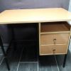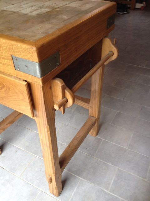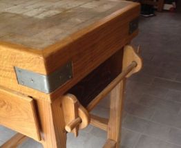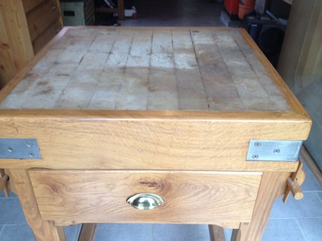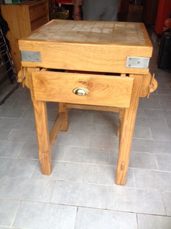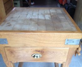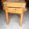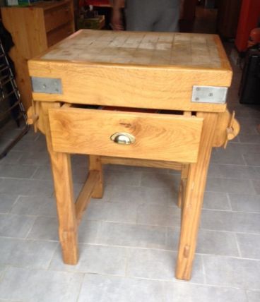 Billot restauré en chêne et hêtre. Un tiroir avec une poignée dorée