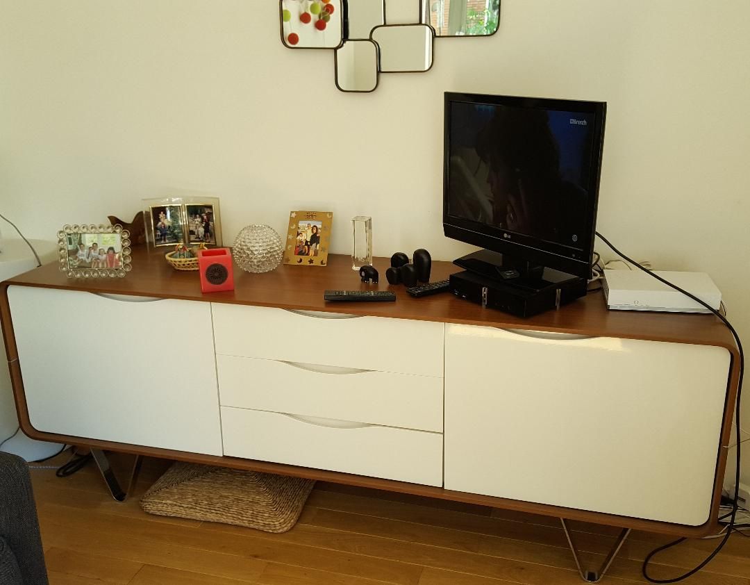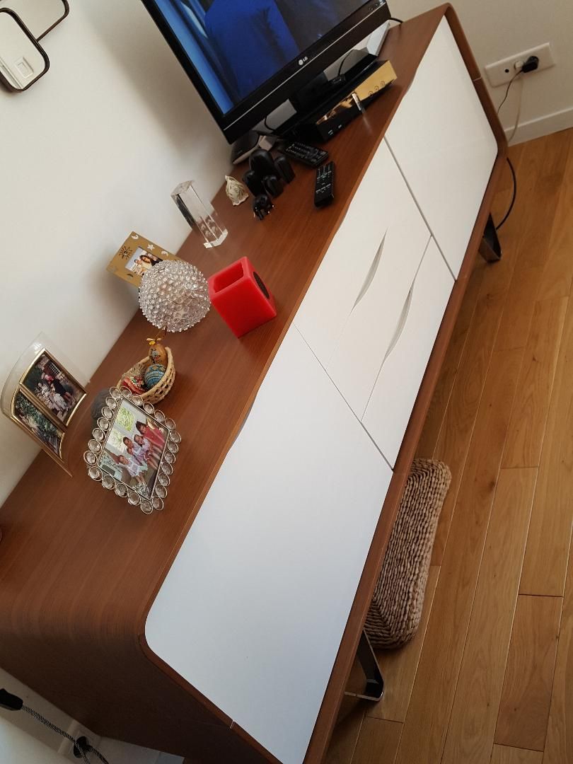 Buffet bas laqué blanc plaqué noyer ton naturel. Portes et façades de tiroirs médium laqué blanc brillant. Structure intérieure blanc. Pieds acier chromés.