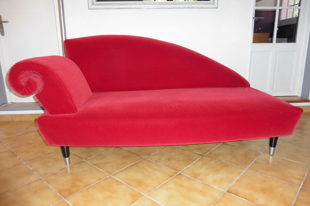 Méridienne en velours rouge, pieds en bois et métal. Longueur: 1,80 m, largeur 0,80 m. En parfait état