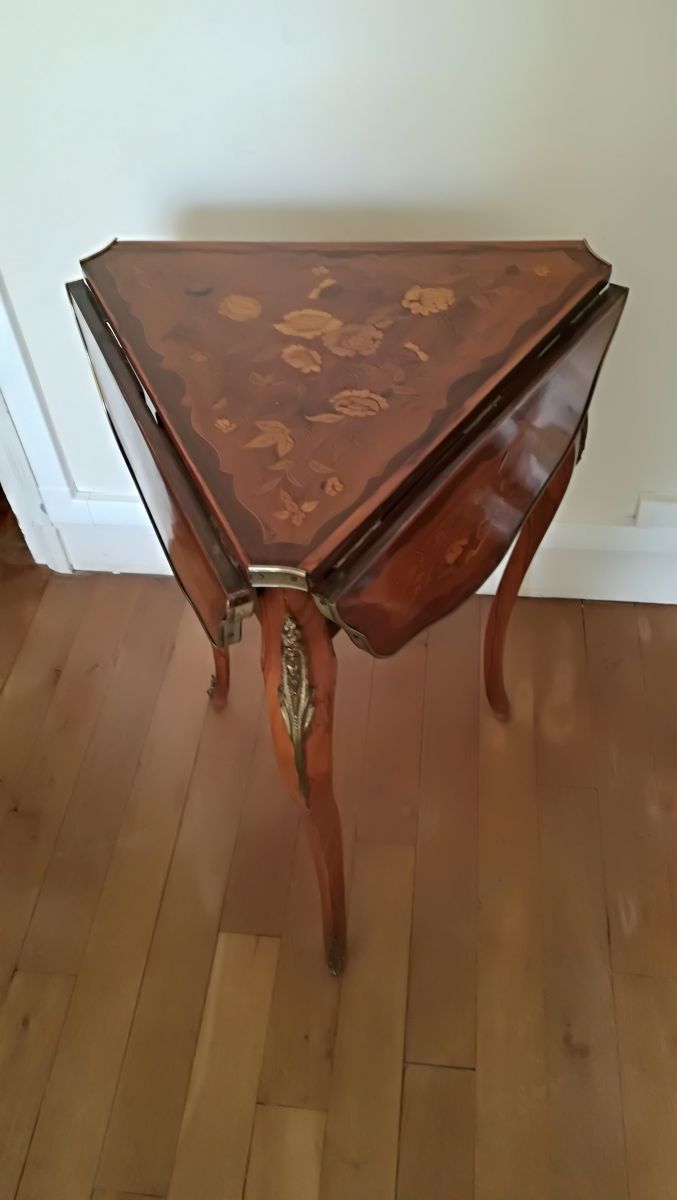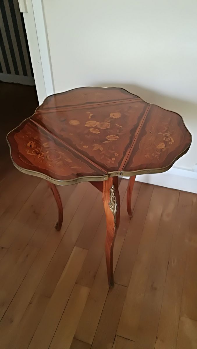 Guéridon marqueté de bois précieux exotiques, époque 20ème siècle. Possibilité d'être fermé ou ouvert.