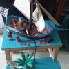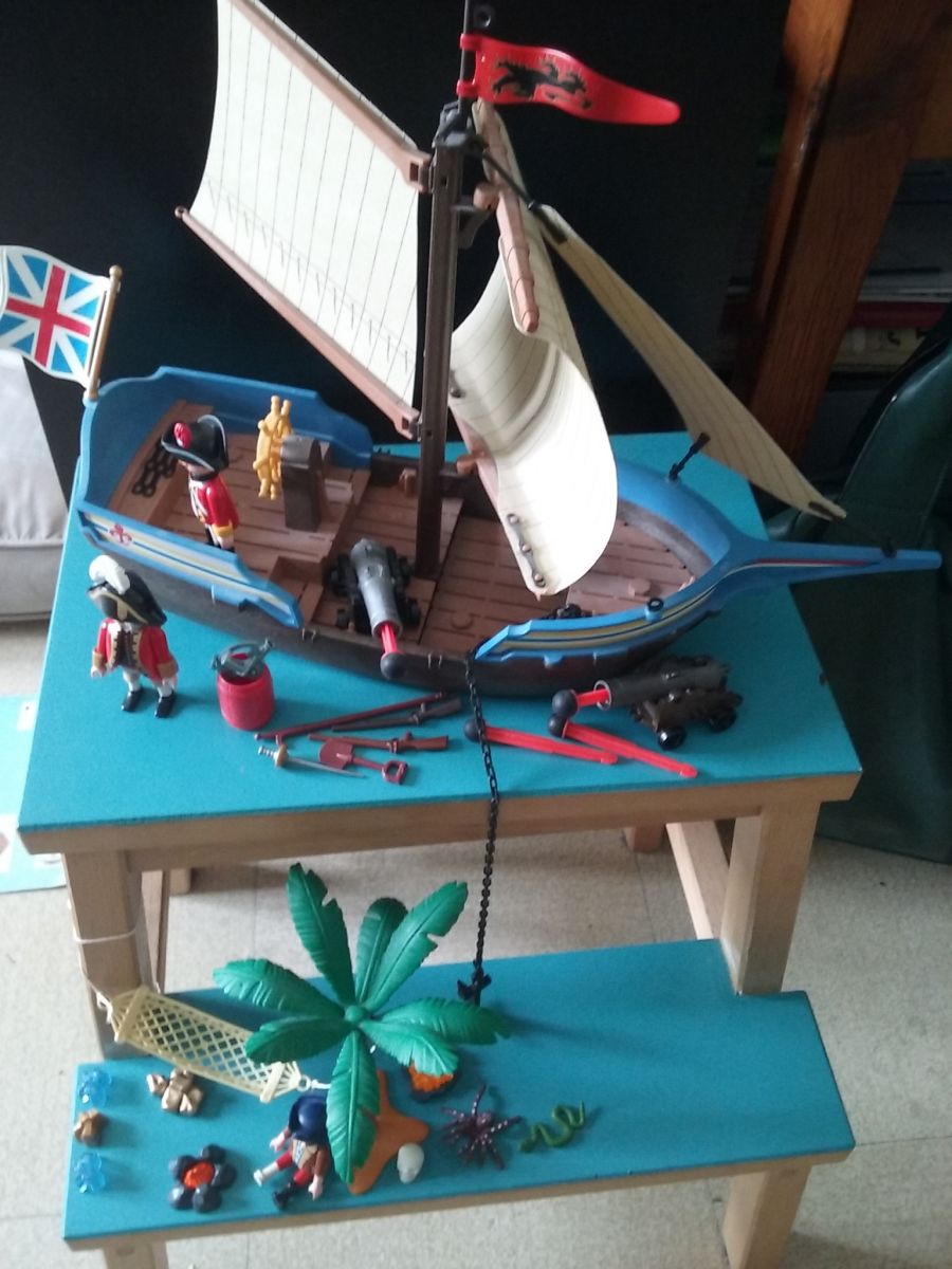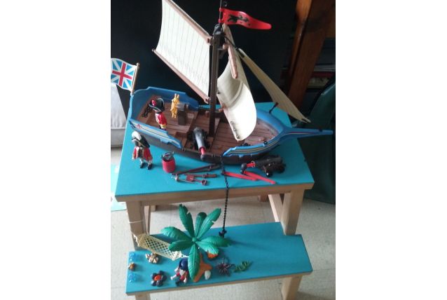 bateau playmobil, tout les élements d'origines sont là sauf une hache, mais je rajoute une canon supplémentaire ainsi qu 'un personnage et ses accessoires .