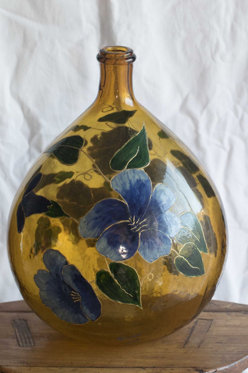 Dame Jeanne couleur ambre décoré d'un grand décor de peinture émaillé de volubilis bleu, il s'agit d'une peinture d'amatrice mais qui est très bien réalisée. elle fait 2600gr.