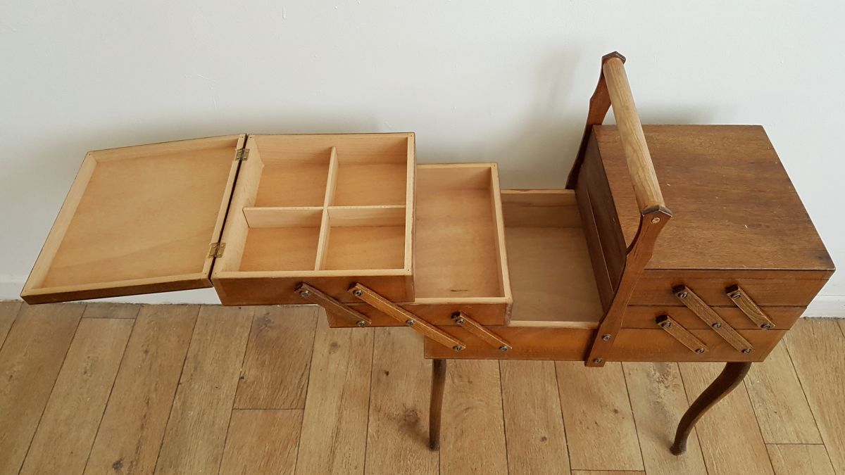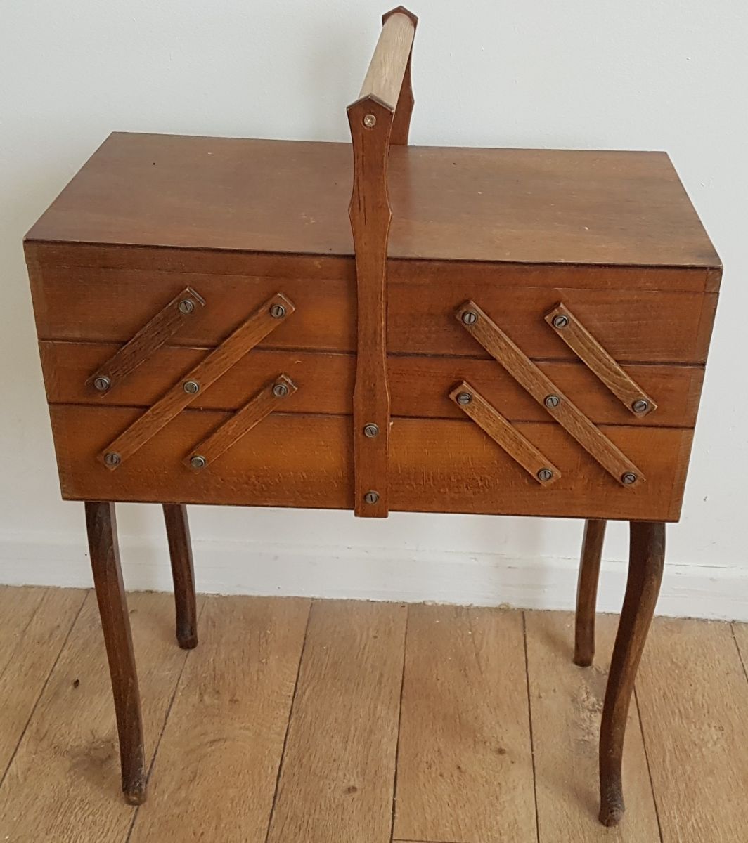Vends une boite à couture ou à ouvrage vintage en bois et sur pied. A retirer sur Cergy ou alentours 95 car pas de possibilité d'envoi compte tenu de la taille.