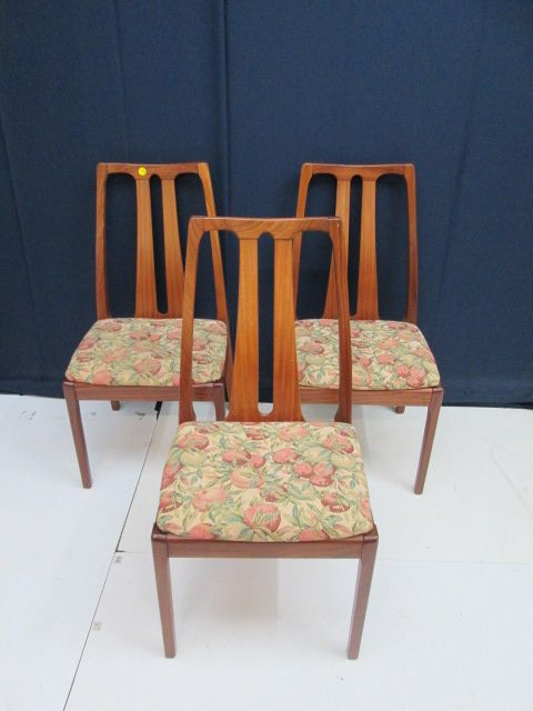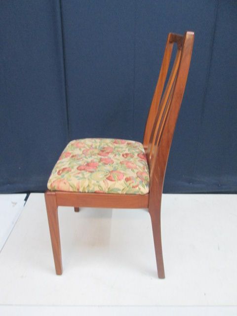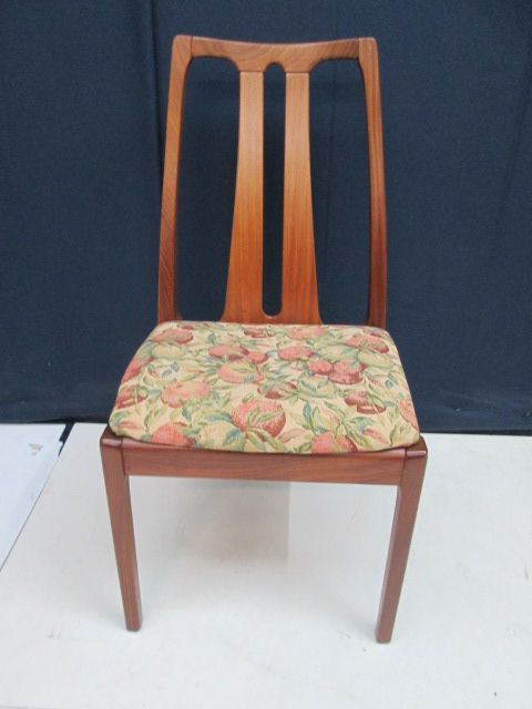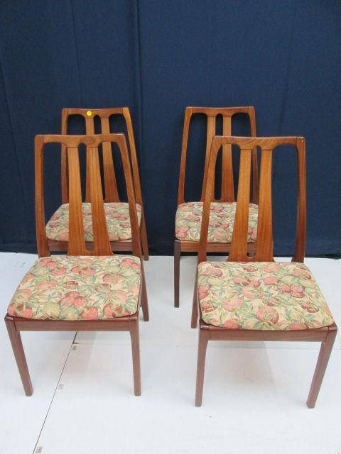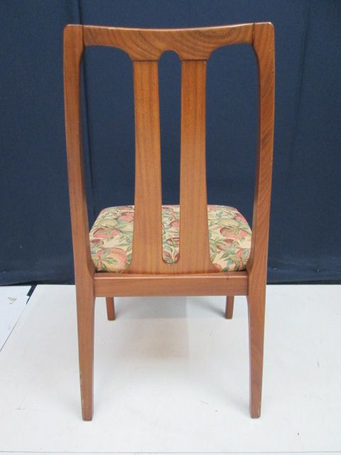 Série de 4 chaises en teck vintage ,de marque Nathan ,nous avons la table qui peut aller avec.Très confortables avec le dossier à barreaux verticaux et le fond en tissus tendu.Les assises sont faites en galettes retenues par 4 simples vis,il sera donc très facile de changer le tissus.(Ev0418/1008A)