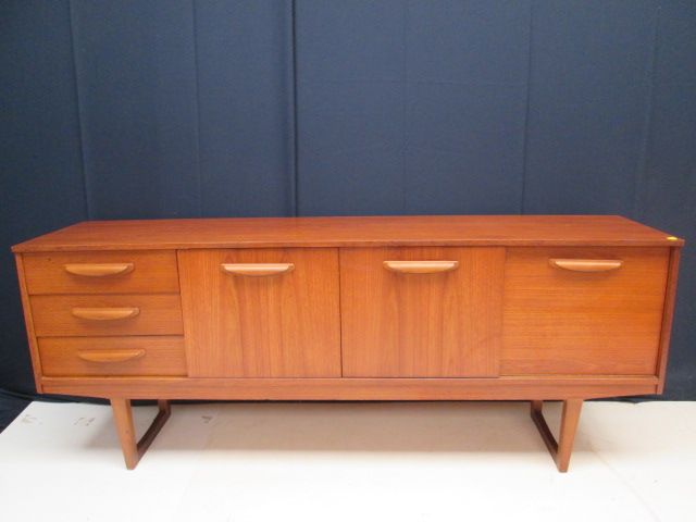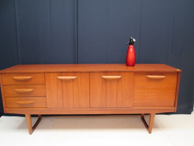 Enfilade en teck vintage de facture sobre et classique qui aura sa place partout,elle se compose de deux portes au milieu ,une serie de trois tiroirs sur la gauche et un abattant sur la droite.D'une couleur teck miel elle sera très facile à assortir.Jolies poignées en bois à large prise et pieds en forme de traineau lui conférent beaucoup de chic .Livraison partout en France 149€ sf Corse