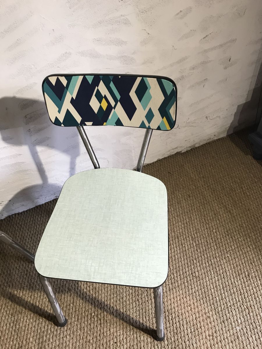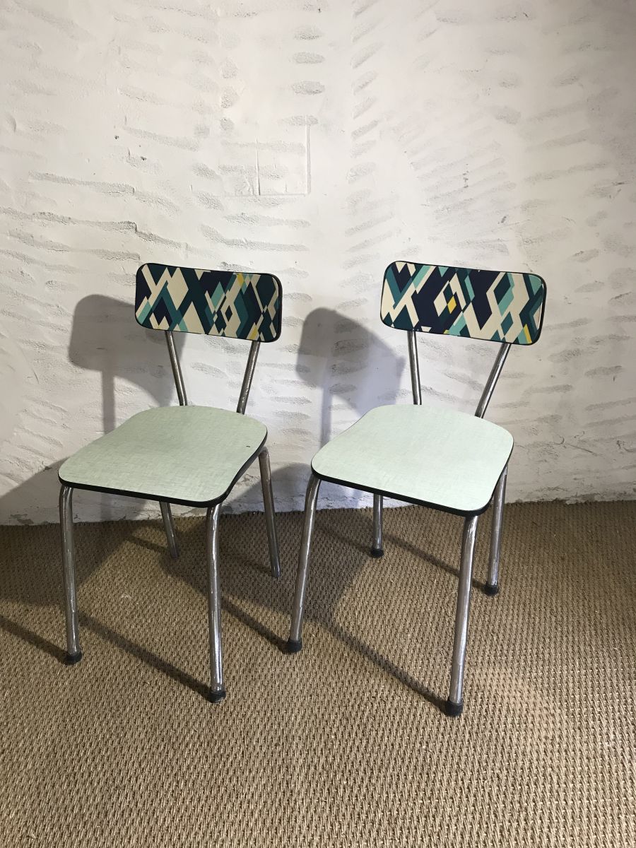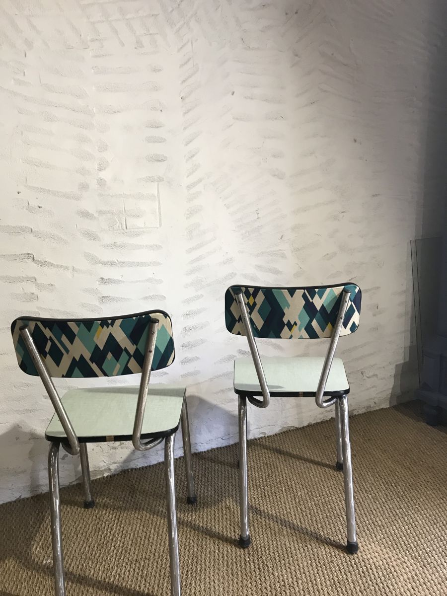 Deux chaise en Formica dossier revisité Et assises vert d’eau