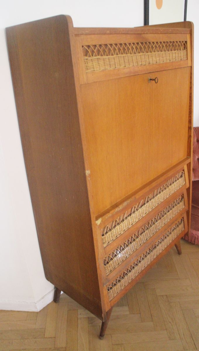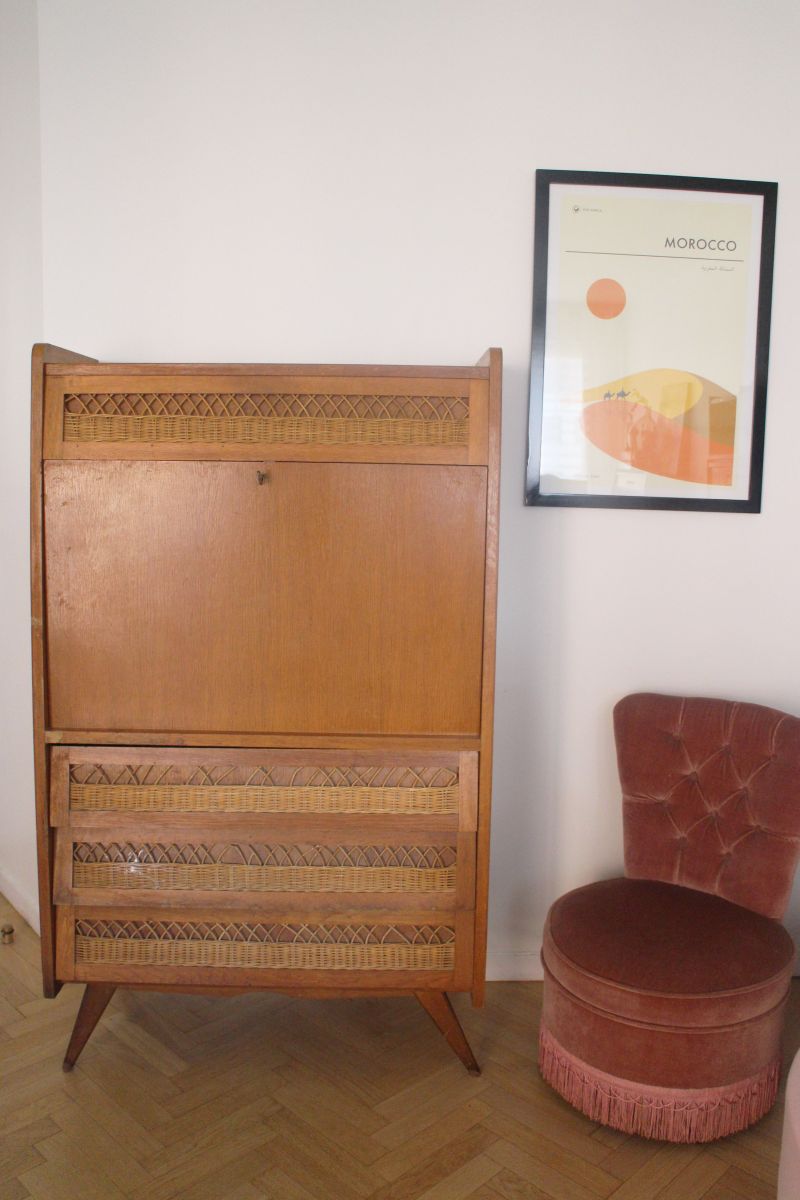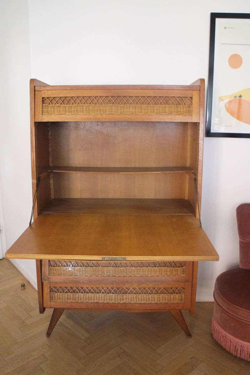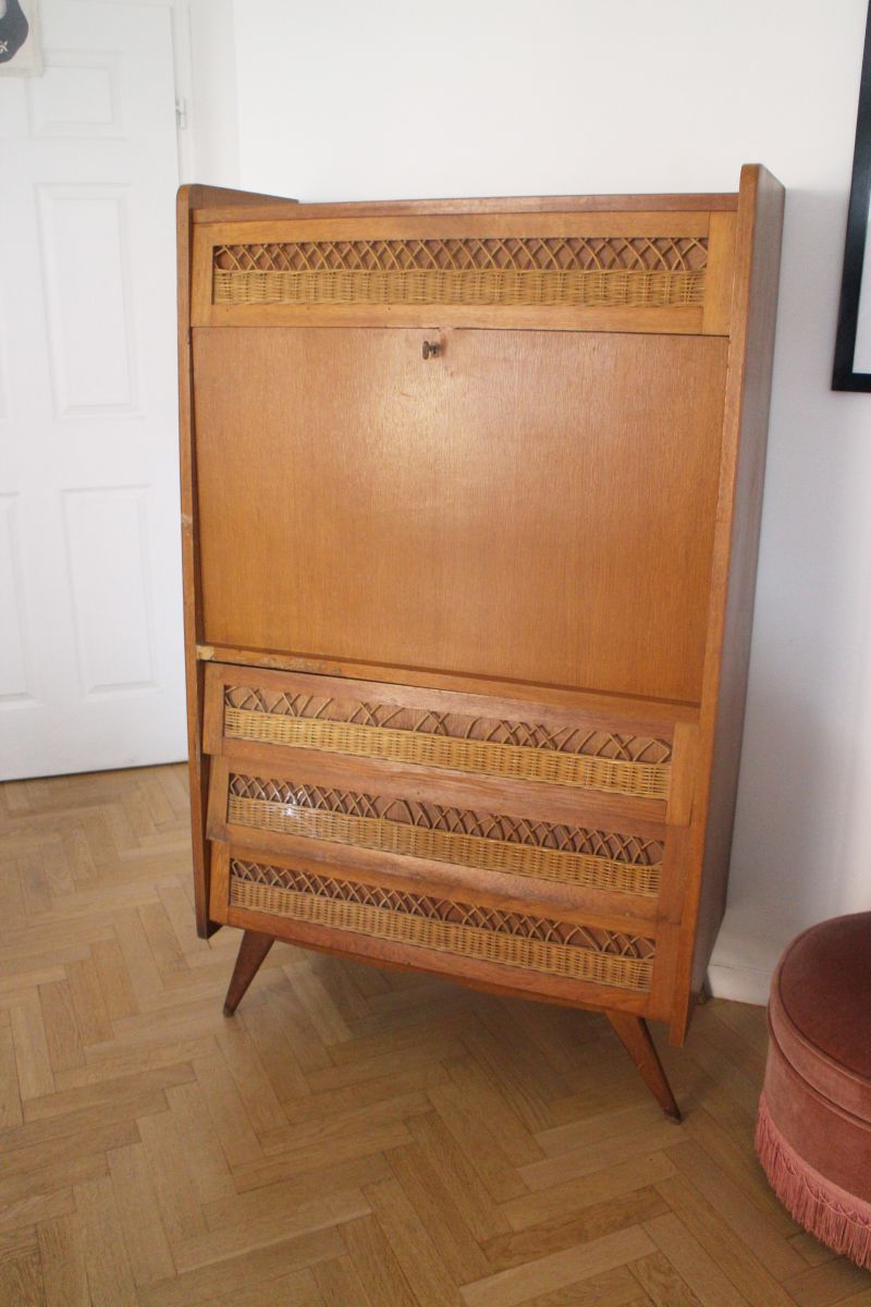 Secrétaire vintage rotin pieds compas à rénover