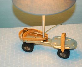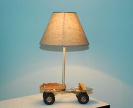 Ces deux lampes ont été créées de manière artisanale à partir d'une paire de patins à roulettes chinés. Les abat-jours beiges sont neufs.