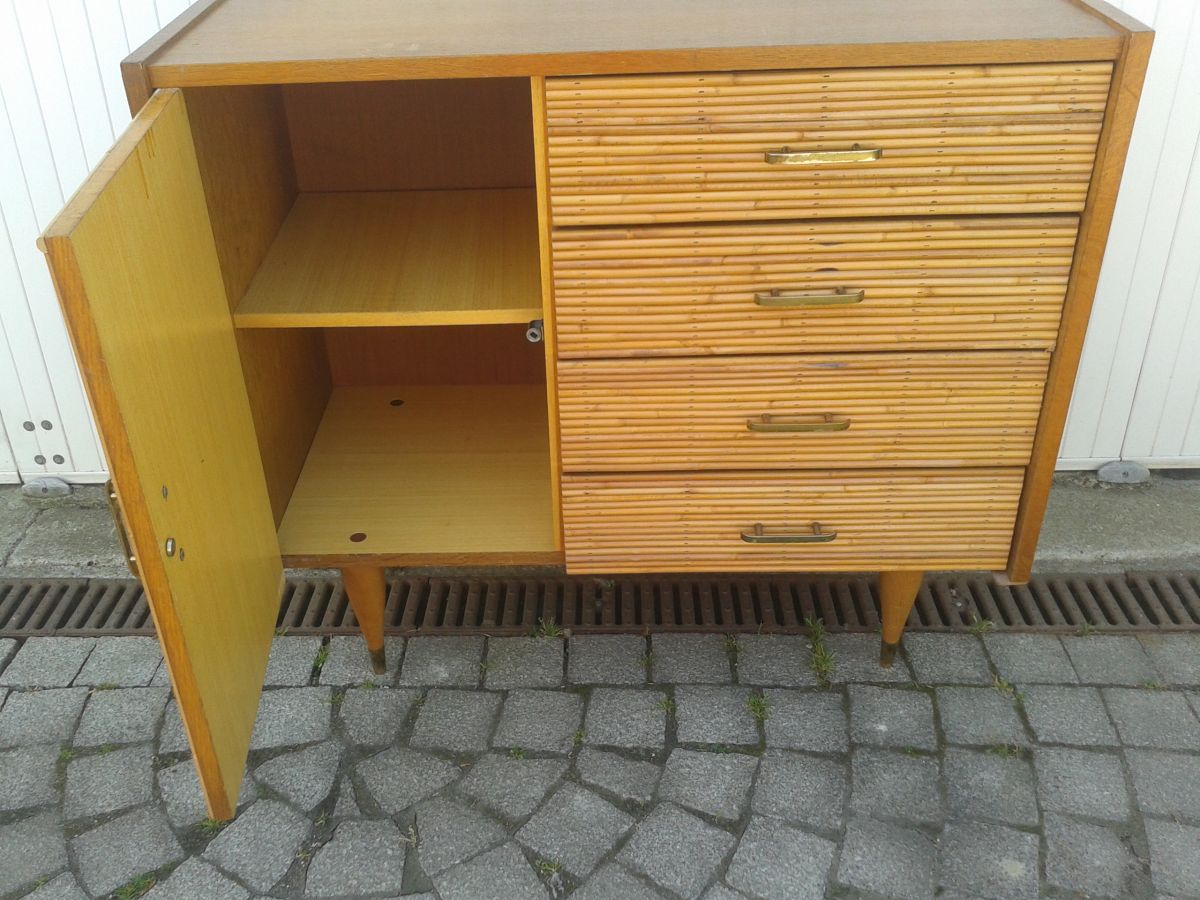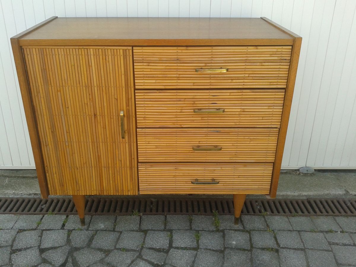Petit buffet rotin avec une porte à gauche et une série de tiroirs à droite,les cotés sont comme le dessus en bois lisse et clair.