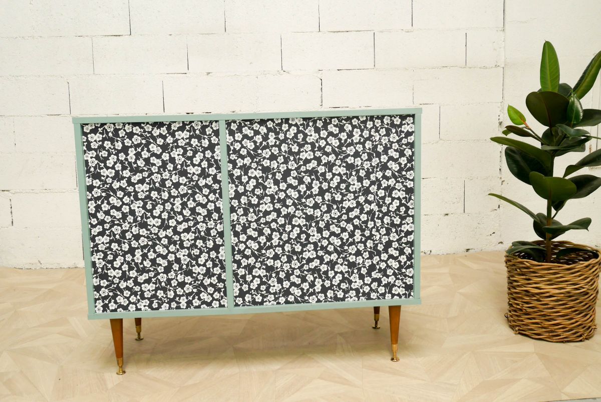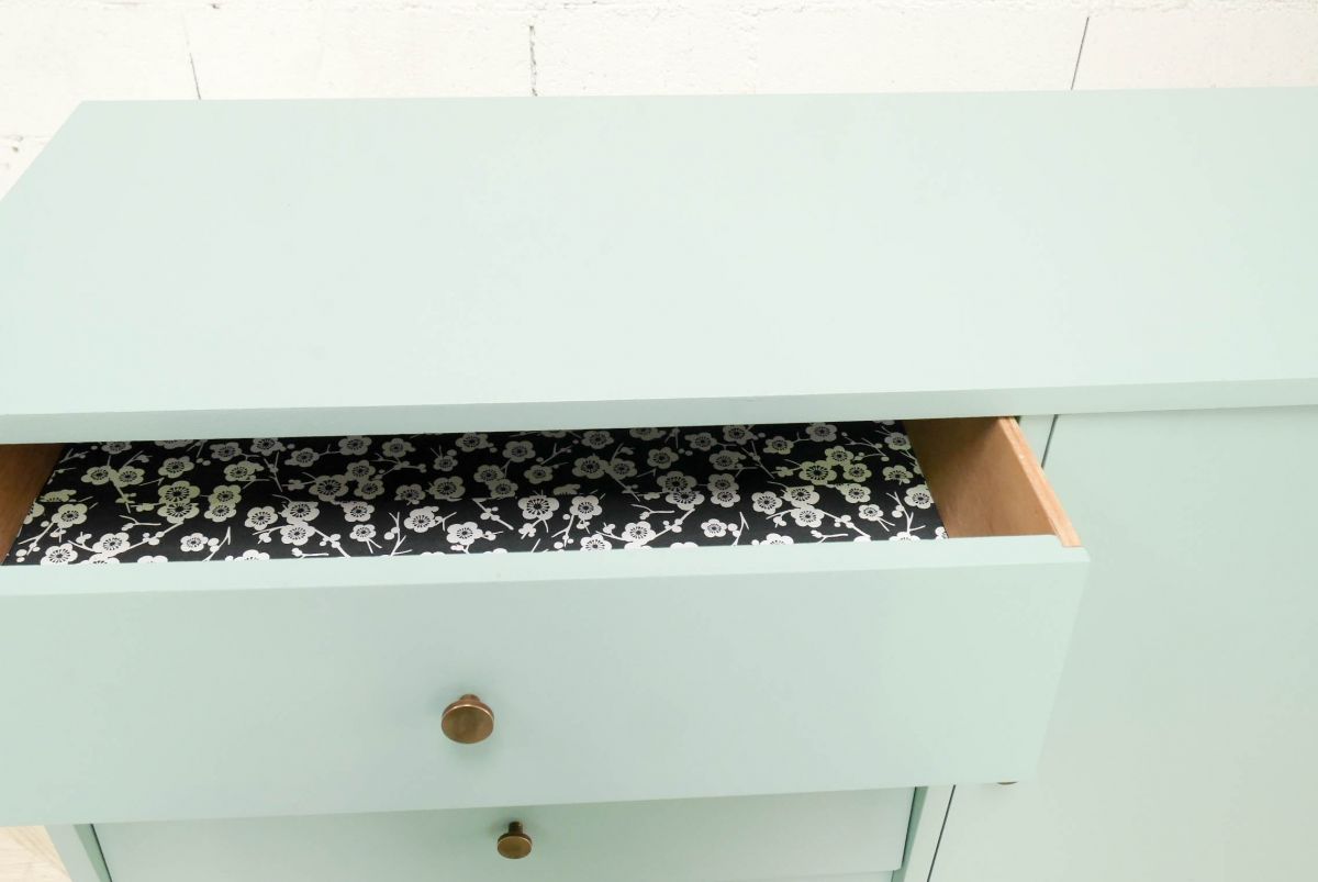 Jolie commode enfilade rénovée en bleu-vert (Esmeralda du nuancier Flamant).