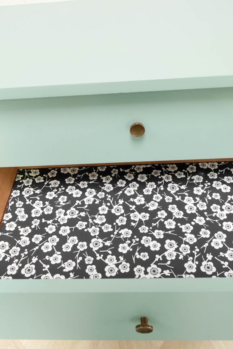Les tiroirs et le dos sont tapissés de papier peint (2 faux raccords sont à noter : un au dos, et un dans l'un des tiroirs).