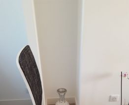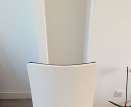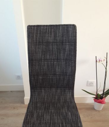 Chaises en très bon état, gris chiné et dossier laqué blanc brillant.
