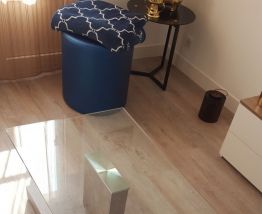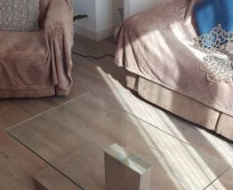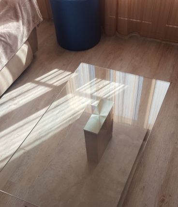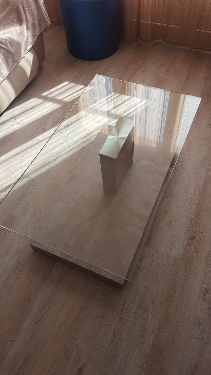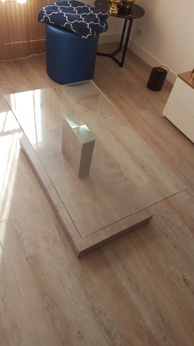 Nous vendons une belle table basse plateau de table verre de sécurité de 10 mm, pied imitation béton achetée en janvier 2017 (facture disponible) pour cause de déménagement.